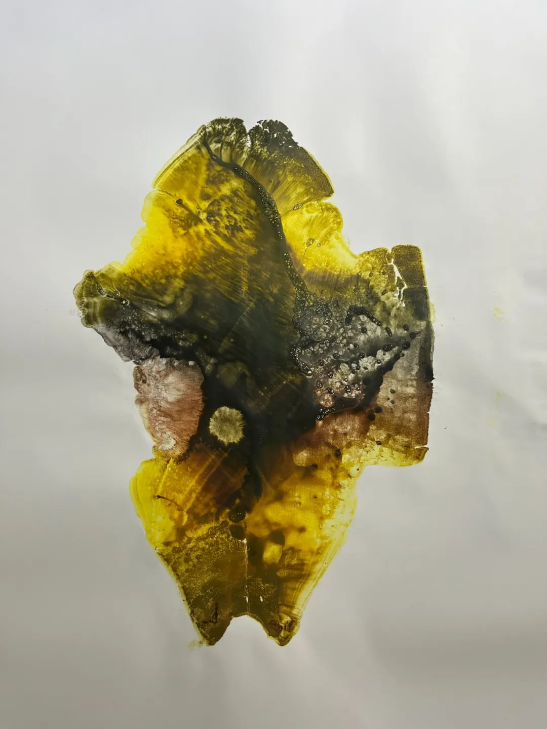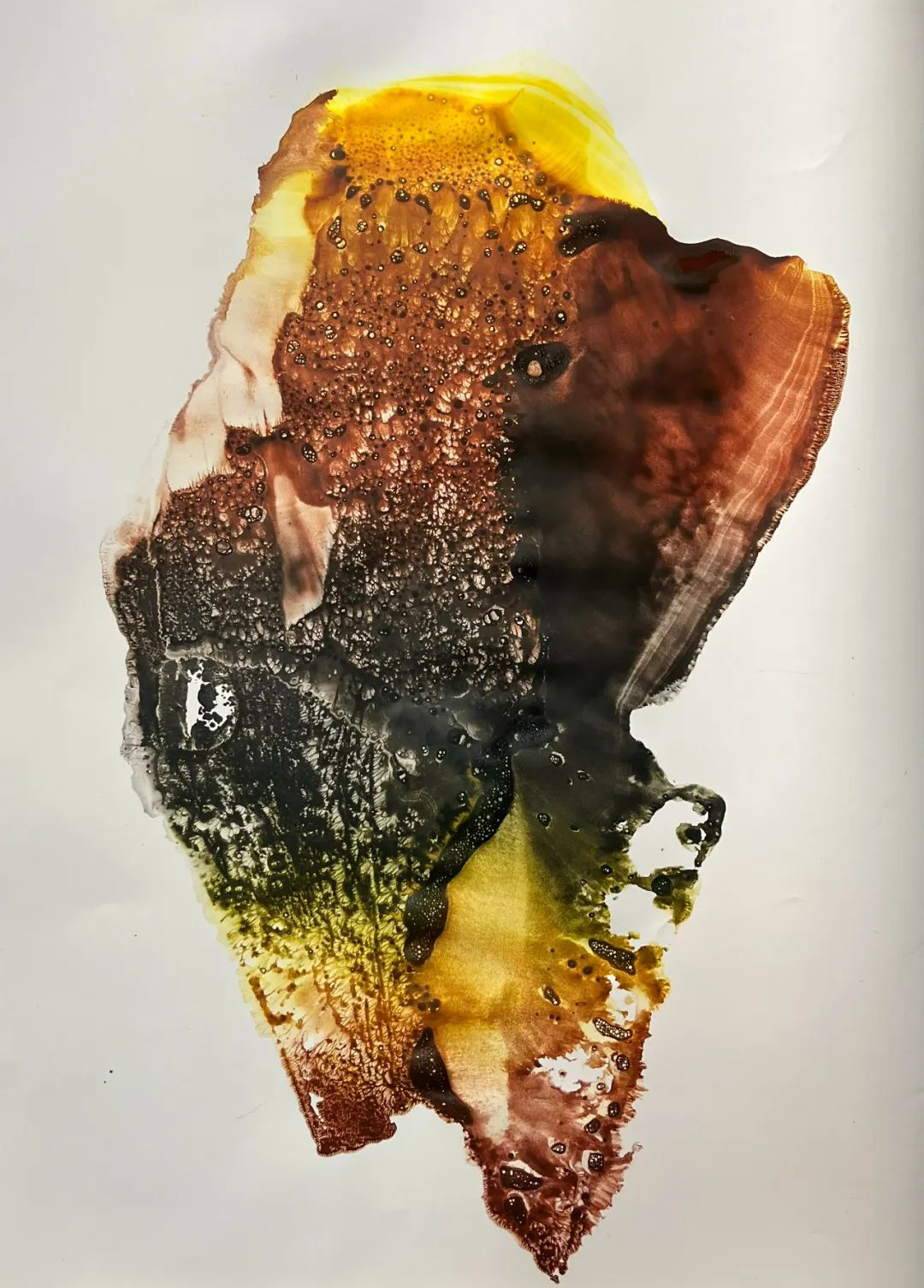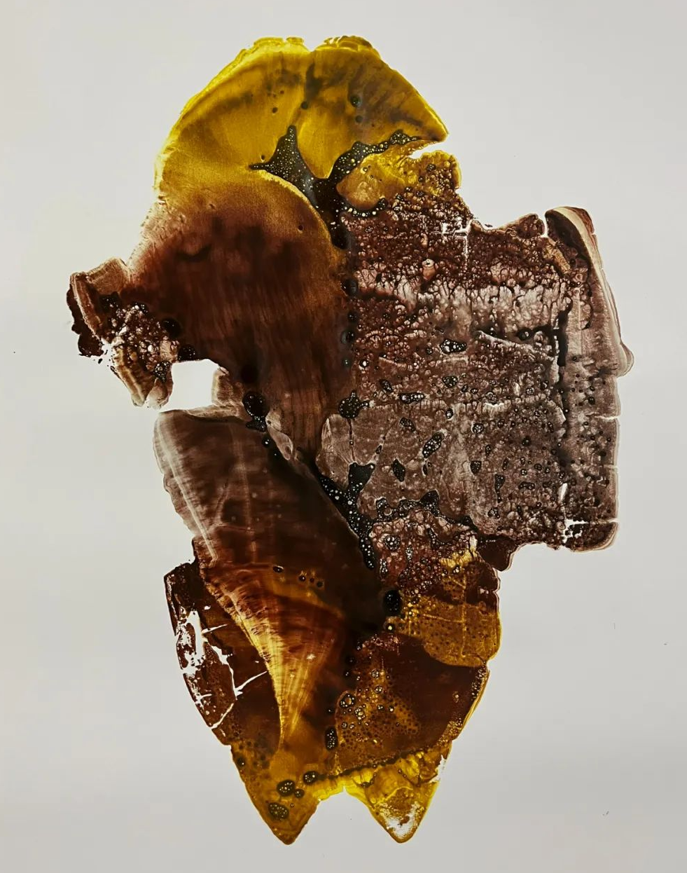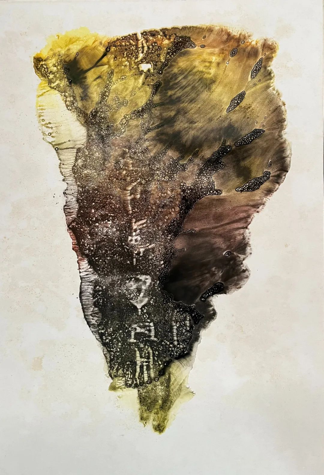 本来经过上千年的变迁,甲骨之龟甲,其色彩就很丰富、神秘。如何注入我理解的色彩?如何切入我内心深处的膜拜与寄托?这是最能发挥我主观能动作用的切入口。作为曾经丝绸图案设计师对色彩的理解与应用,作为二十多年版画家生涯对“印痕”的驾驭与诠释,作为一个半调子“诗人”的痴人说梦,作为一个做功课半百的“行脚人”,这之于我是一个新的创作命题,“芝麻开门吧!”