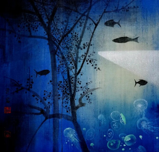 我可能较为喜欢运用蓝颜色,在画纸上营造出一种既似曾相识又难以言状的视觉体验。那抹生命中夜色中的蓝,好像从我家门口的池塘里,从年少就一直跟着我,从南到北,又从北到南。所以,我的画面常常模糊了物质与虚拟、真实与幻觉之间的界限,让观者不禁重新思考这个世界最本质的颜色,而蓝色,让这个五彩缤纷的世界又增加了许多的神秘和可能性。