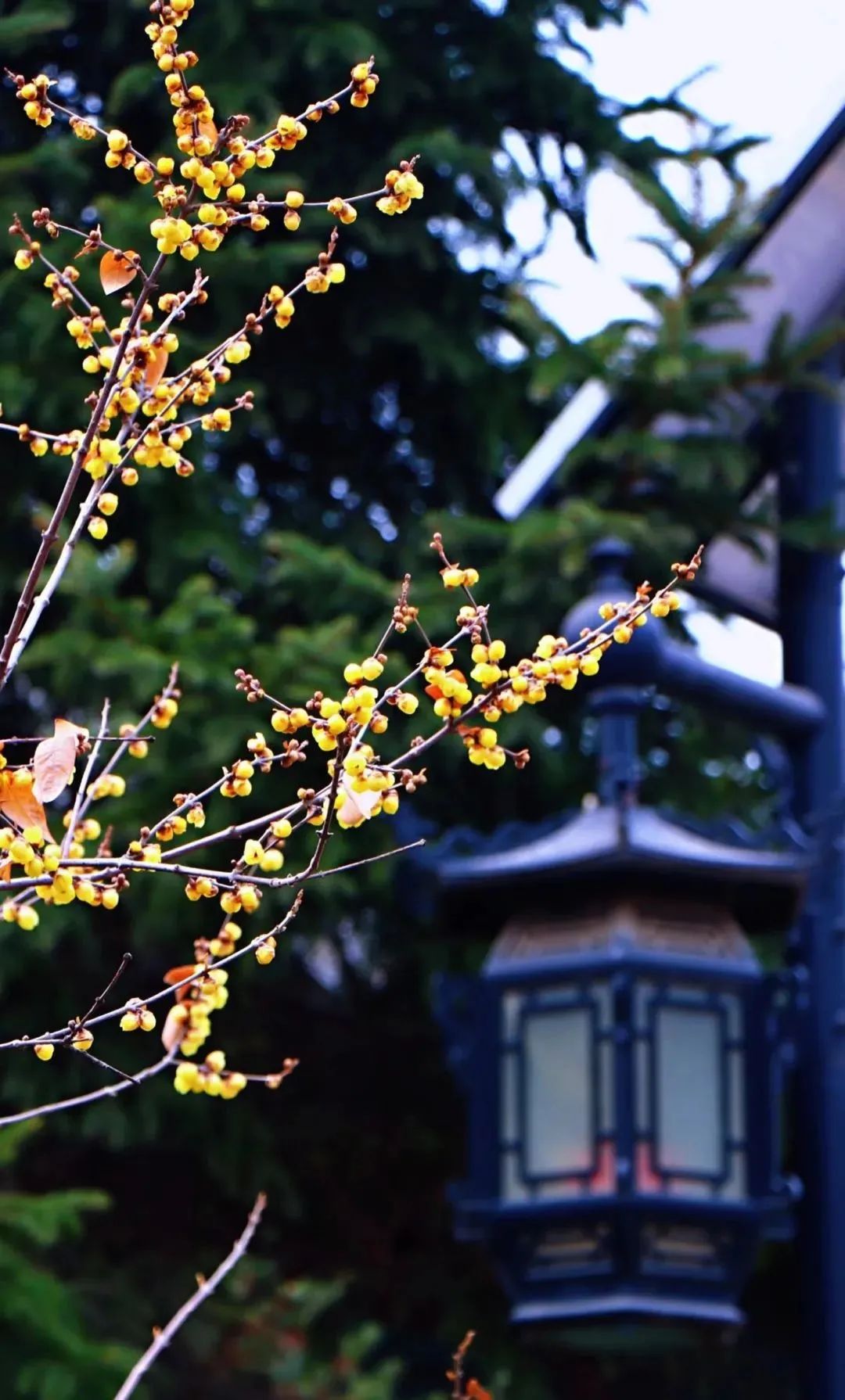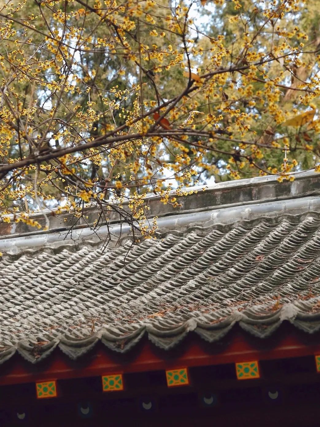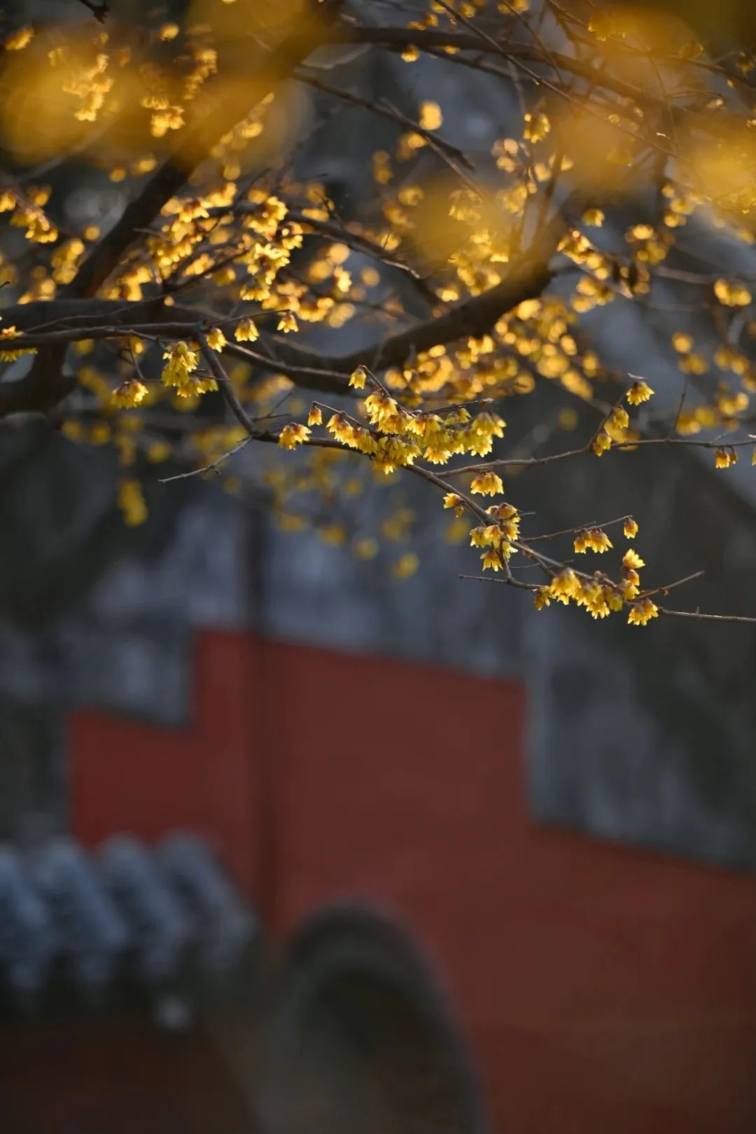 在沂山风景区的东镇庙,蜡梅开得逸趣横生,枝丫上的点点金黄,粉雕玉琢般的精致与优雅,在古建黛青色瓦片衬托下更加明媚欢快。