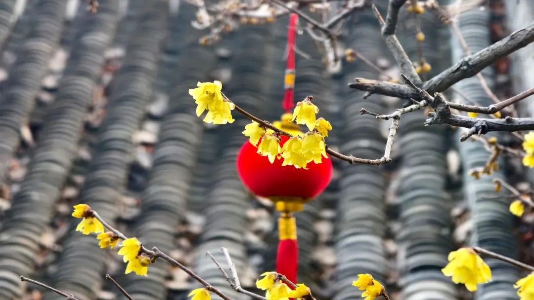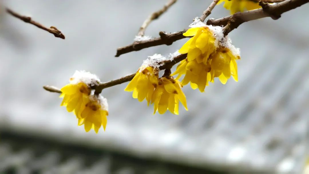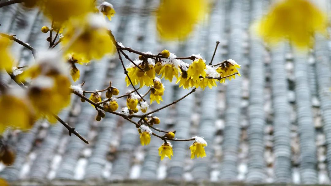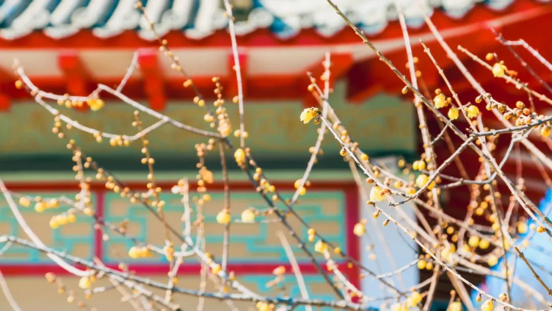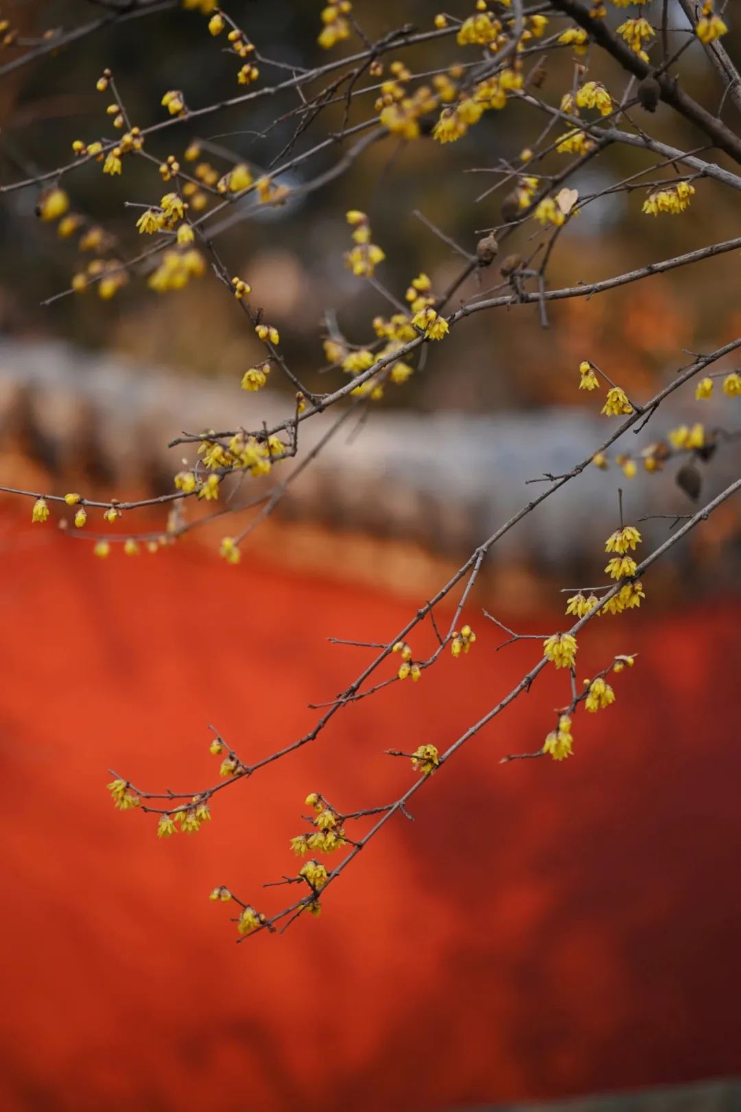 在沂山风景区的东镇庙,蜡梅开得逸趣横生,枝丫上的点点金黄,粉雕玉琢般的精致与优雅,在古建黛青色瓦片衬托下更加明媚欢快。