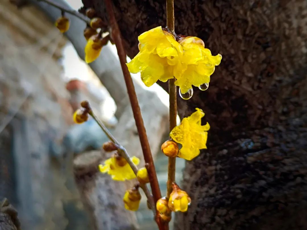 走进山顶的栖云阁,星星点点的蜡梅藏在主阁的西北角,有的含苞待放,有的花开正盛,嫩黄的花瓣在风中摇摆,缕缕暗香萦绕四周。