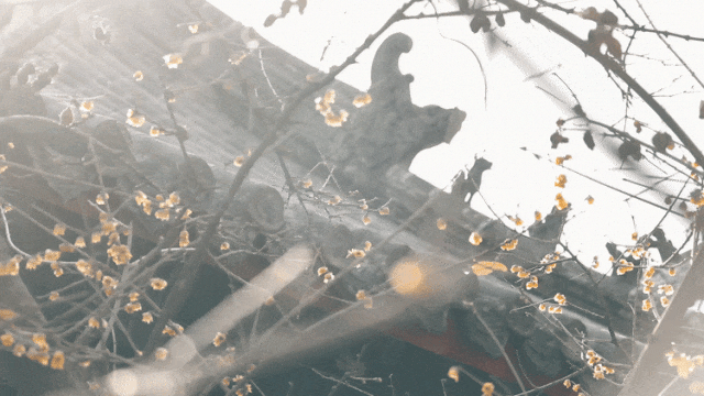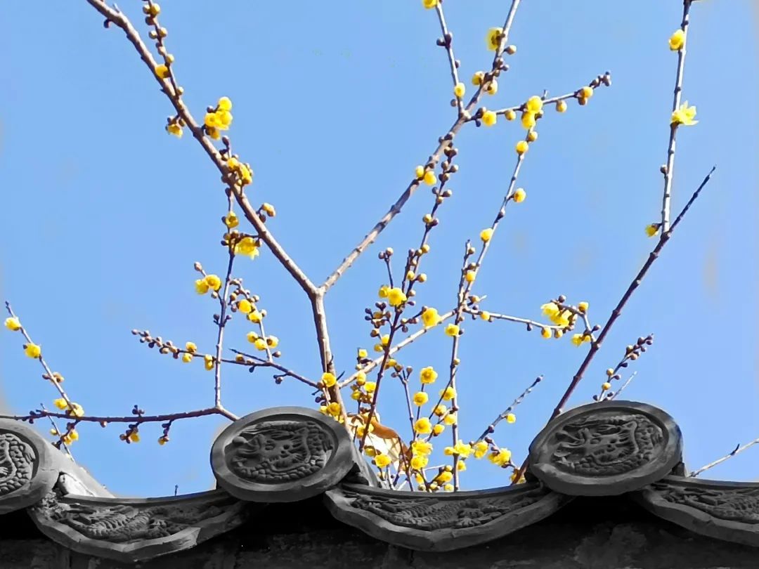 海云庵内青砖灰瓦,形成天然的背景布,澄澈金黄的花朵在古意浓郁的建筑前,更显明艳照人。定格一张蜡梅照片,古韵与静谧的感觉油然而生。