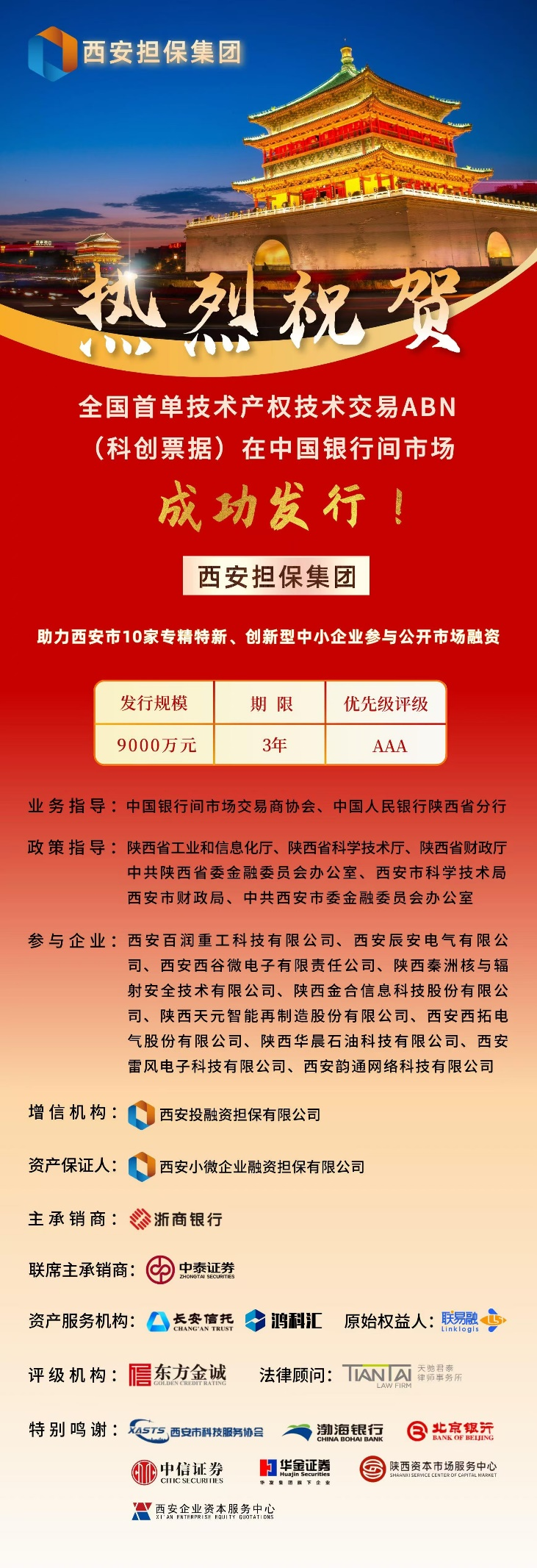 本项目票据端由西安担保集团所属的西投保提供增信、小微担保公司为基础资产保证人,助力西安市10家专精特新、创新型中小企业参与公开市场融资。这是银行间债券市场首个以高新技术企业所拥有的技术产权及技术合同应收账款质押为依托的项目,为科技型企业提供了创新型融资渠道。项目过程中,中泰证券全方位、高效率的支持与服务得到了客户的高度认可,西安担保集团专门向公司致信感谢。