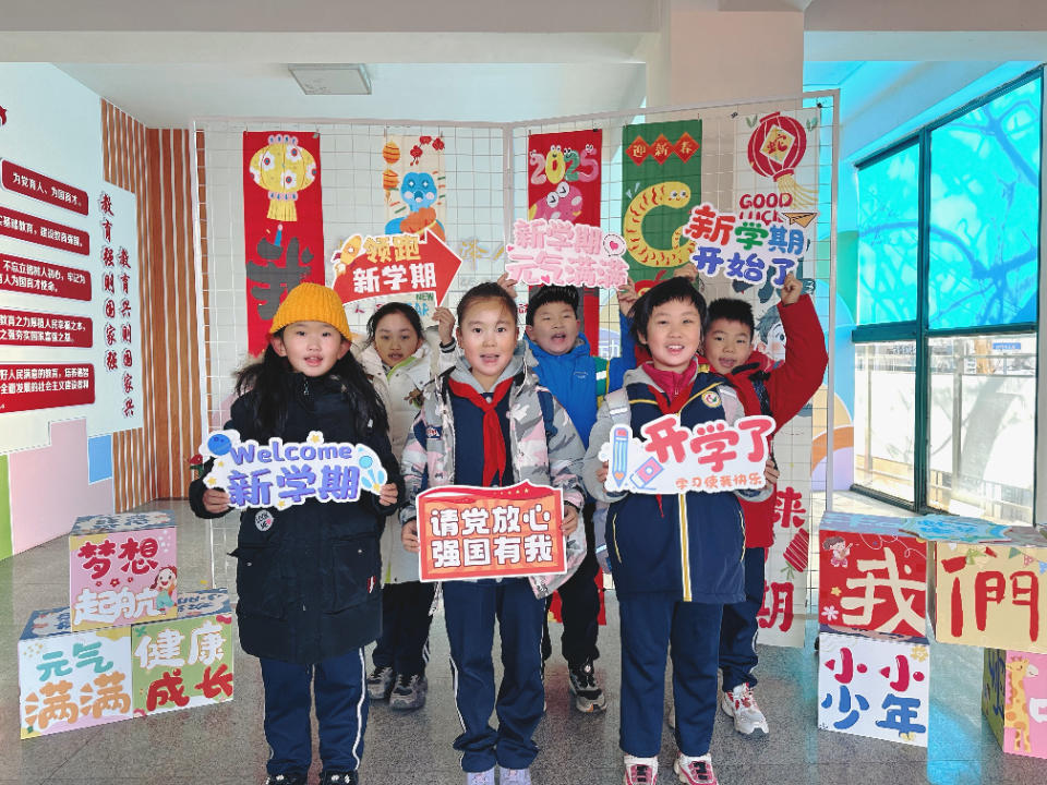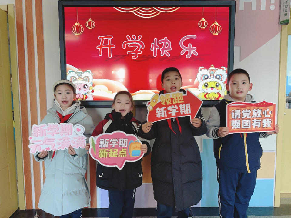 开学当天热闹非凡,同学们在喜庆的开学背景板前持手牌拍照打卡,开启新学期崭新篇章。