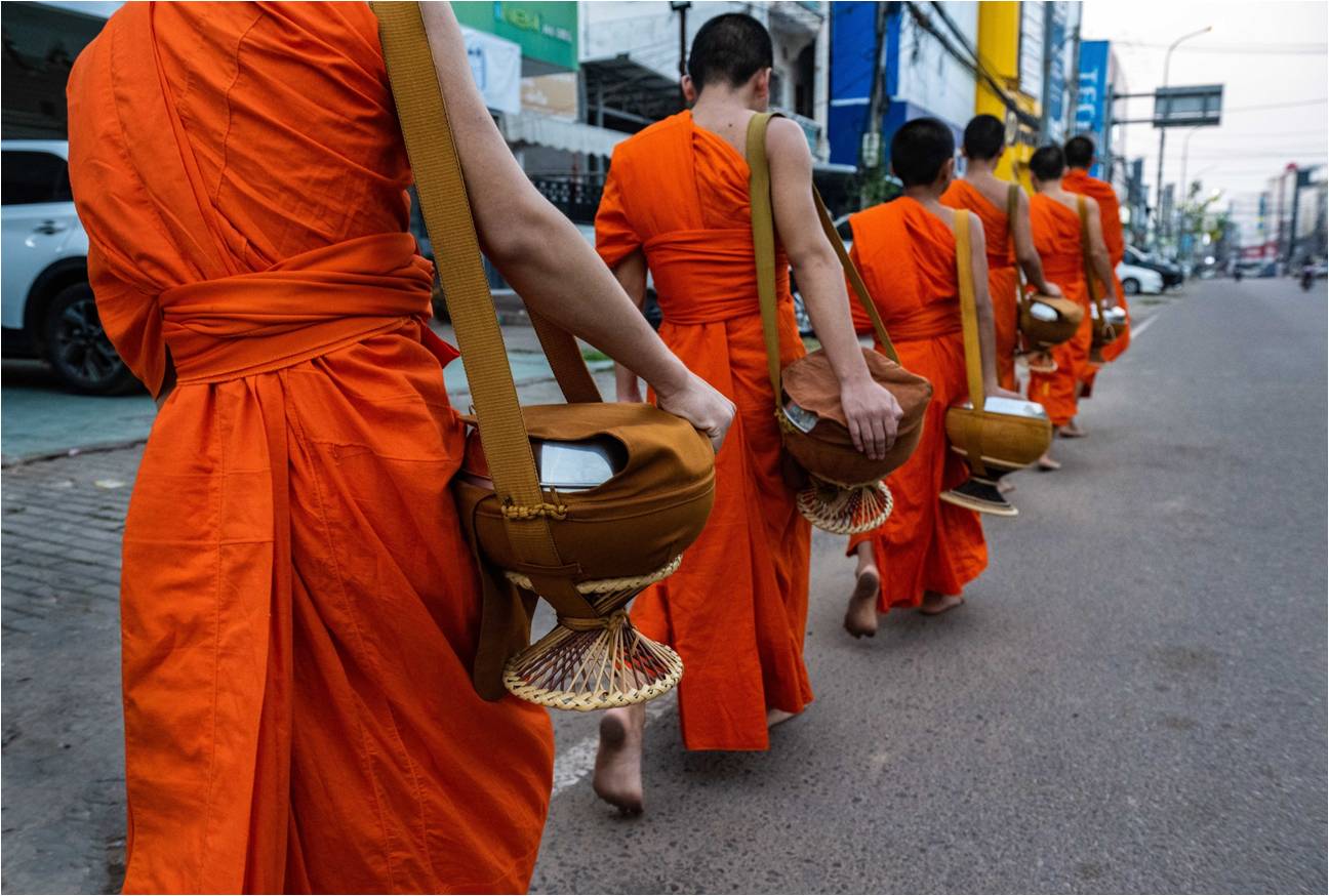 2024年4月14日,老挝,清晨出寺庙化缘的橙衣僧人。
