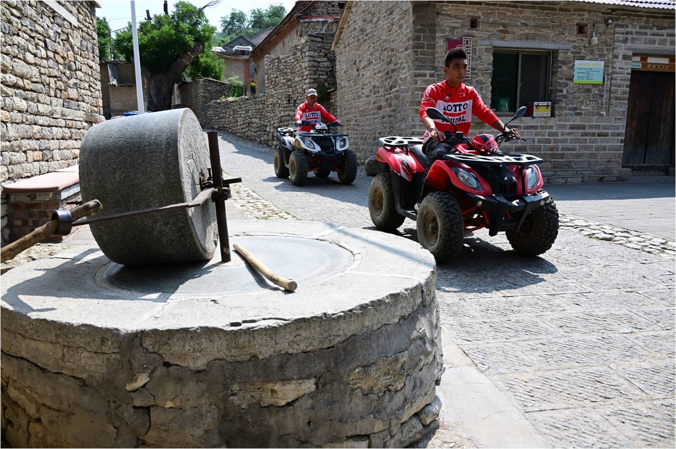 2024年6月17日,山东省淄博市淄川区太河镇峨庄乡柏树村,游客开着越野摩托车游古村落。