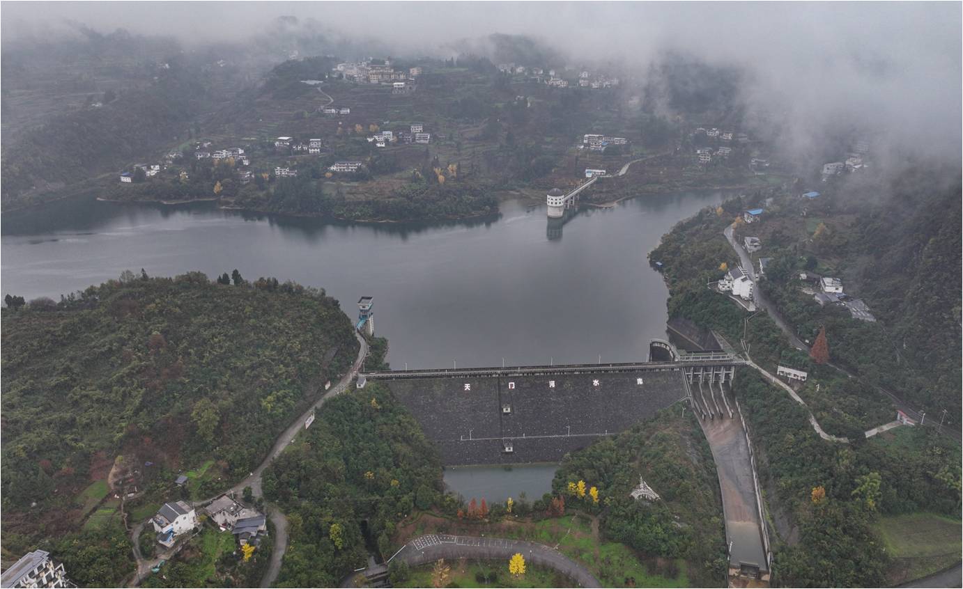 2024年12月4日,航拍贵州省桐梓县娄山关镇天门水库(小西湖),抗战时期的天门河水电站用水,正是由它通过具有较大落差的明渠提供。