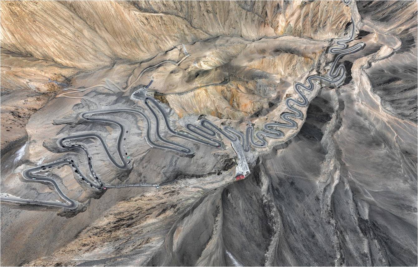 2024年10月16日,新疆喀什,航拍盘龙古道,古道横卧帕米尔高原,75公里600余湾,如巨龙盘踞山脊,海拔落差千米,惊险壮美,被誉为此生必驾的云端天路 。