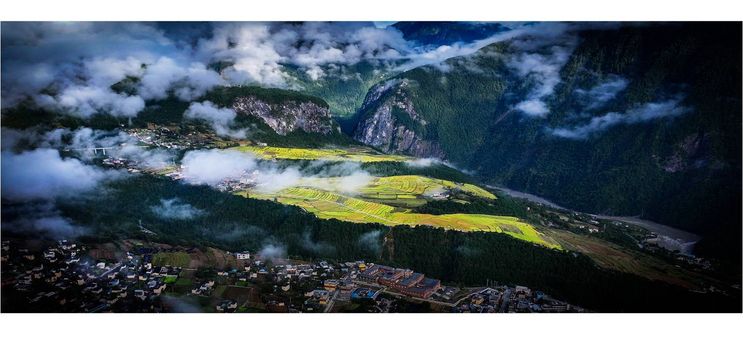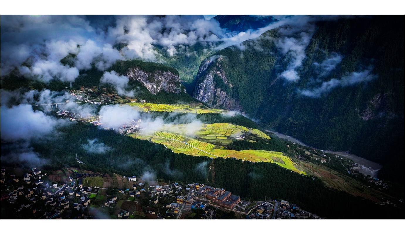 2024年9月27日,云南省怒江傈僳族自治州贡山独龙族怒族自治县,透过云雾航拍梯田、油菜和村落风光。