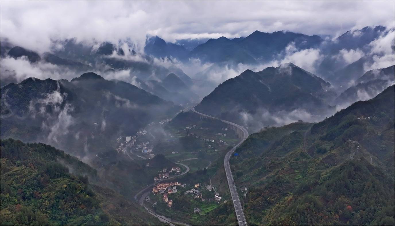 2024年12月5日,贵州省遵义市大娄山红色文化主题服务区,航拍兰海高速公路(G75)穿行群山的风光。