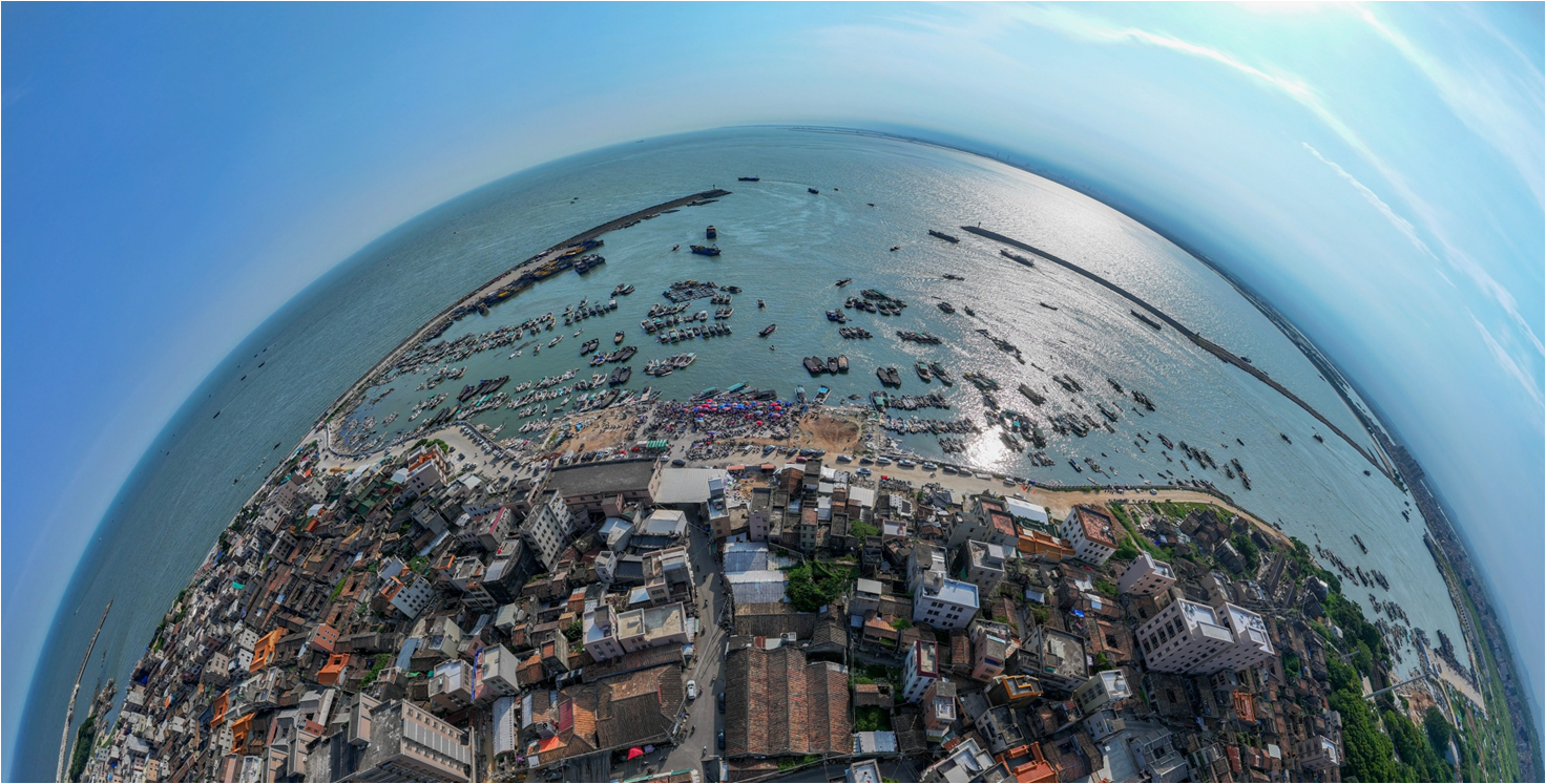 2024年8月27日,广东省揭阳市惠来县靖海镇出海口,航拍渔村与繁忙进出渔港的渔船。
