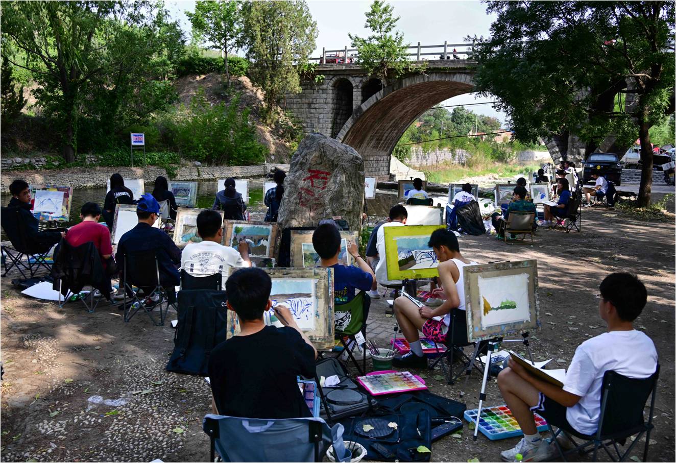2024年6月12日,山东省淄博市淄川区太河镇峨庄乡大集上集体写生的艺校学生。