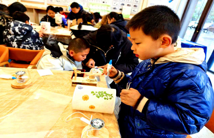 最后在手工体验环节,孩子们迎来压花台灯制作。老师分发材料包后,孩子们就充分发挥自己的创意,通过和爸爸妈妈的相互协作一起动手排列粘贴干花、装饰灯罩、组装灯座,纷纷顺利完成了自己心目中喜爱的压花台灯。