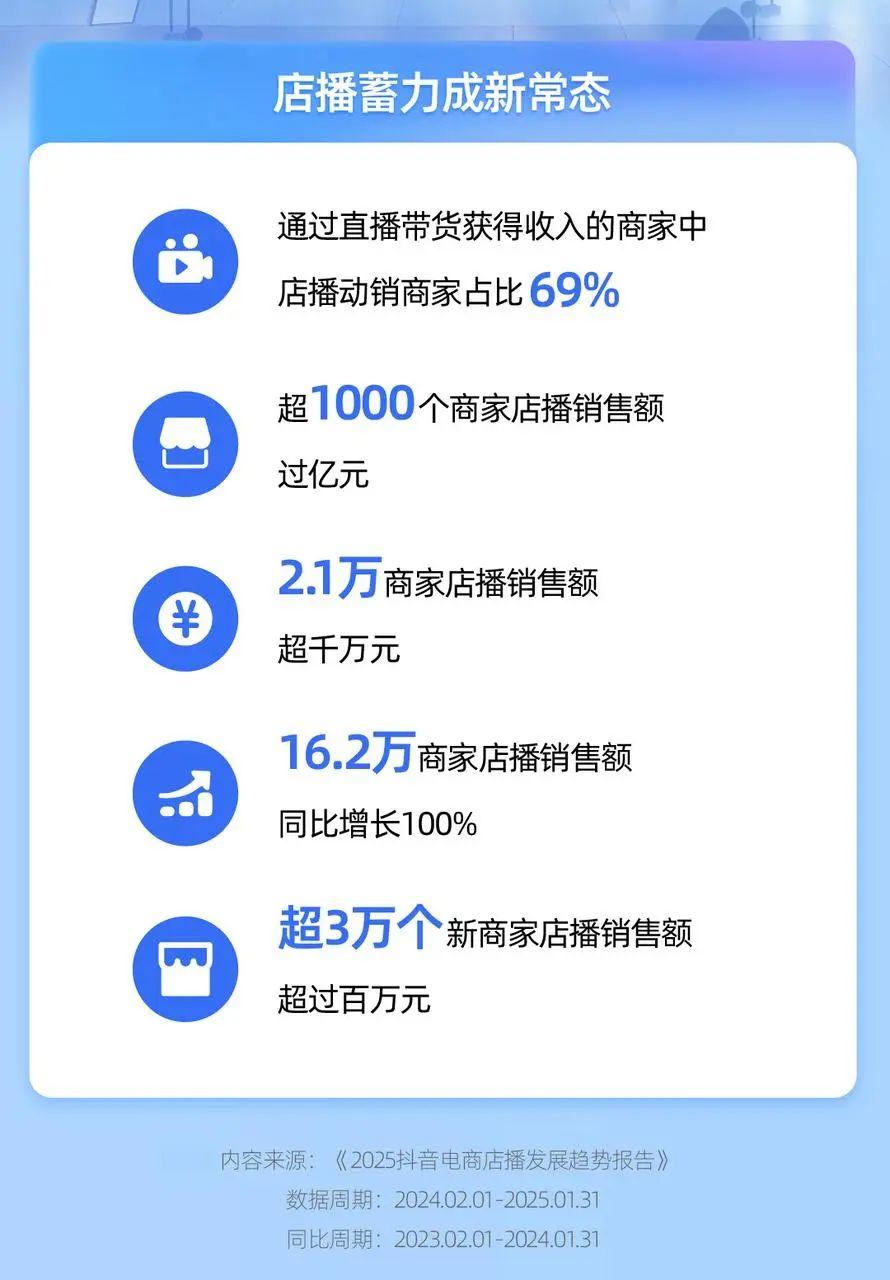 此外,《2025抖音电商店播发展趋势报告》显示:2024年2月至2025年1月,通过直播获得收入的商家中,接近7成商家通过店播获得收入;店播销售额同比增长100%的商家突破16.2万家。