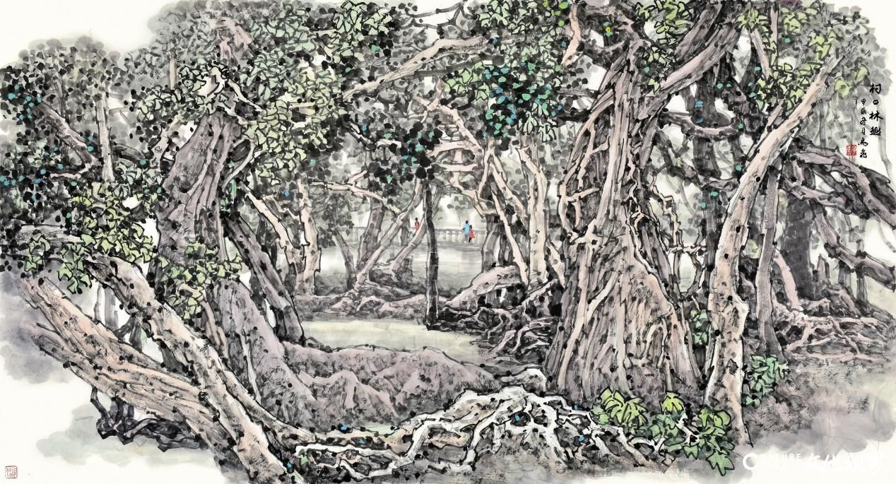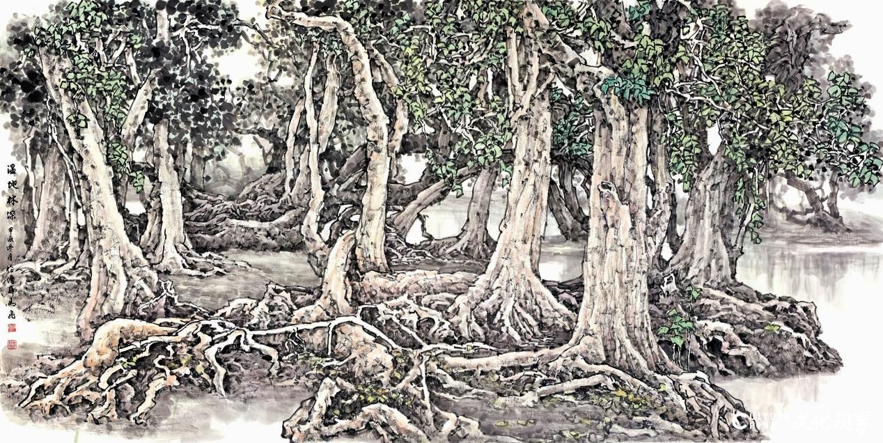 他绘画的题材内容非常丰富,笔下的滨海莽原、巨浪惊涛、山野乡村、黎苗风情、雨林榕树、木棉花红,无不生机勃勃,天然成趣。特别是他画的木棉和榕树,独具一格,逐渐成为其绘画艺术的标志性名片。其它热带植物如椰林、红树、棕榈、芭蕉,在他的作品里都林林总总,森然入画。他的不少作品尺幅都很大,又多是用大笔触大水墨挥洒出来的,具有很强的视觉冲击力,呈现出一种刚阳雄健的正大气象。他决不像小家子气地去抠索什么,而是一气挥洒,达于极致,在笔情墨韵中开拓了热带中国画艺术的新境界,在独立求索中形成了自己的风格面貌。
