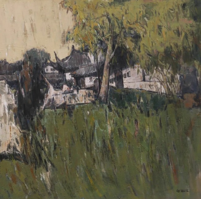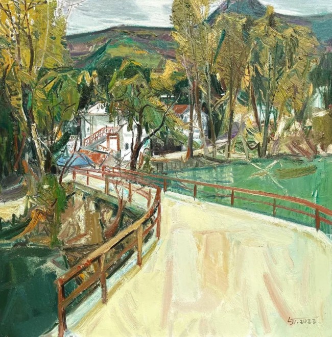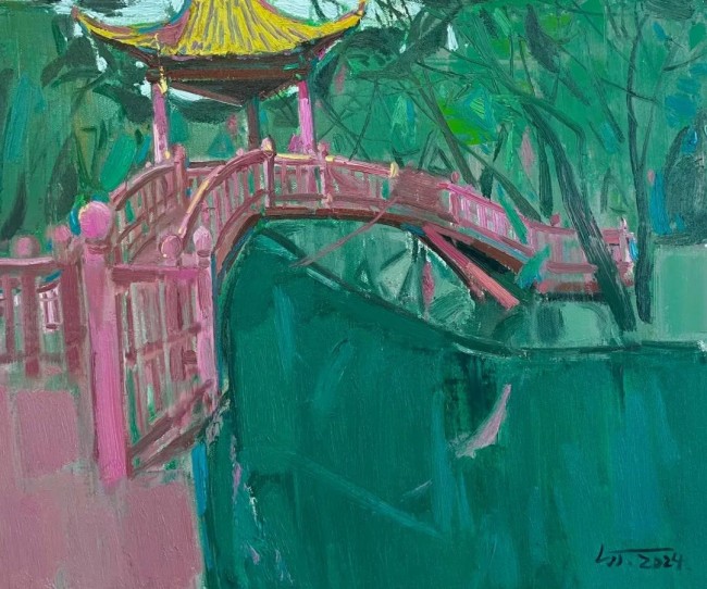 李佳佳的油画色彩极具张力,洋溢着饱满的热情。在《吊桥春色》这幅画中,李佳佳运用了大面积的绿色铺底,描绘了吊桥公园绿色的树以及河中的倒影,河面之上,粉色的桥中点缀着一座黄顶凉亭。在《绰尔河畔》这幅画中,呈现出来的是与前一幅画相反的画风,低饱和度的色彩更好地表达了架子山初春的实际景象。李佳佳认为,绘画是自由的挥洒,只有用画笔去碰触、去感知,才能让心中的景象跃然纸上。