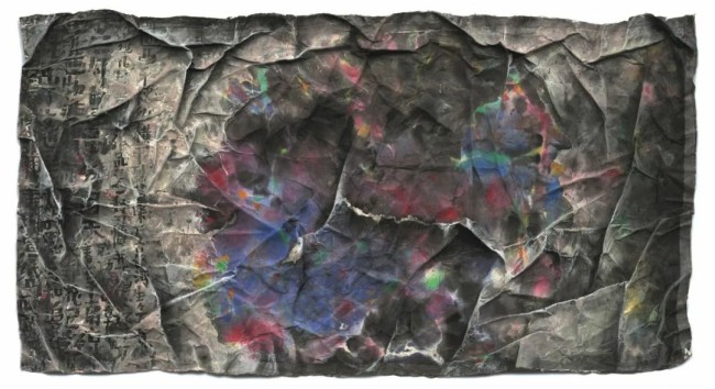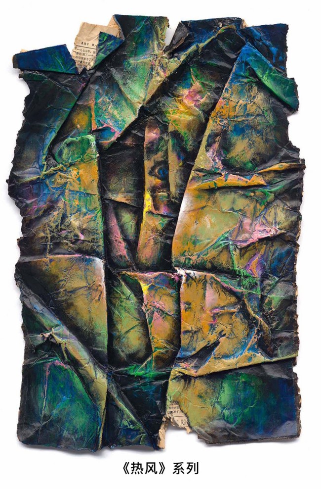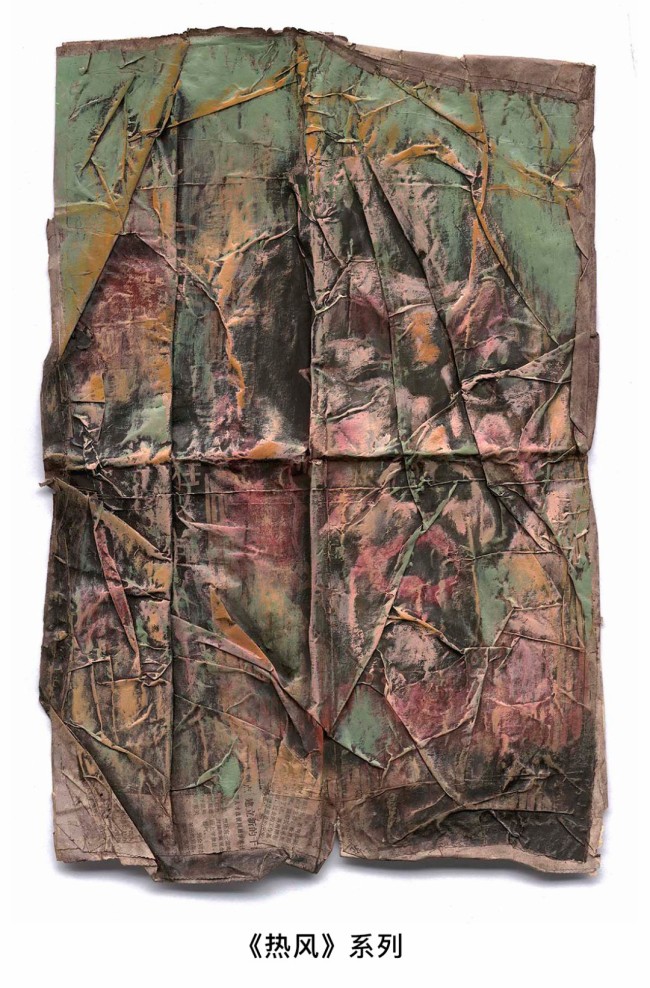 这些年,他透过“撕”重构作品,不断记录时间,形成观念。《热风》系列中,脆弱泛黄的旧报纸被丙烯材料反复覆盖、撕裂,形成类似青铜器的斑驳效果。旧报纸下,时间在柔软地流逝,物质媒介却在“坚硬”地存续。碎片化的生活,常常将我们不断撕裂。当报纸下旧新闻的时效性被凝固,历史记忆被“硬化”后,我们个体又何去何从?学着松弛,学着重构自我,所以他用“撕”来教会我们重启力量。废纸三千,如是大千,三千大千,如见世界。