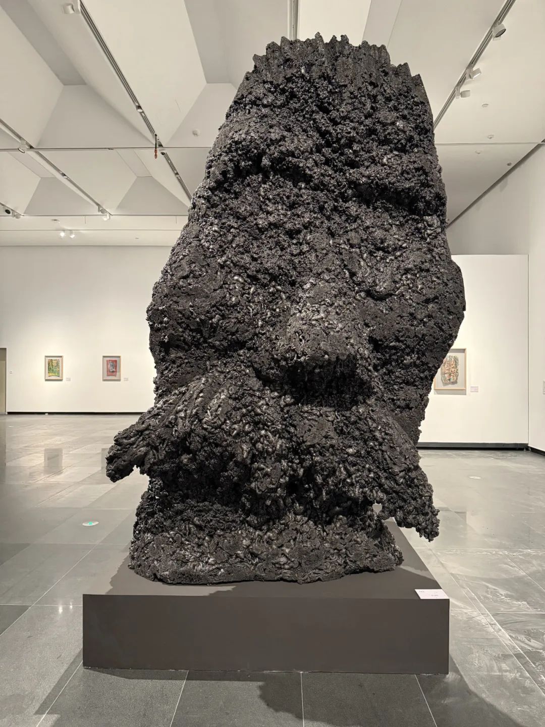 走到展厅末端,有一个像屹立在山上的巨石一样的装置,看起来坚硬无比。抬头望去,鲁迅那标志性的坚硬的一字胡都能看得一清二楚。如果不听解说,我们压根不会发现这是刘春杰用泡沫制成的鲁迅面部形象。泡沫很轻,易老化,易变形开裂,却给人如此坚硬的视觉感。