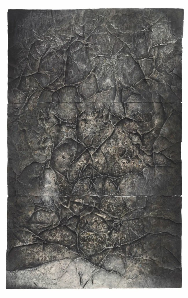 站在作品前,我们幻想着指尖划过表面,它一定会发出尖锐的嘶鸣声。在《无物之象》中,刘春杰将传统木刻的“硬”与水墨的“软”结合,形成独特的艺术语言。通过对宣纸揉搓、拼贴、叠加彩墨与胶质,将传统纸张改造成具有浮雕形态的金属形态,形成“柔软纸张”与“坚硬金属”的视觉反差。