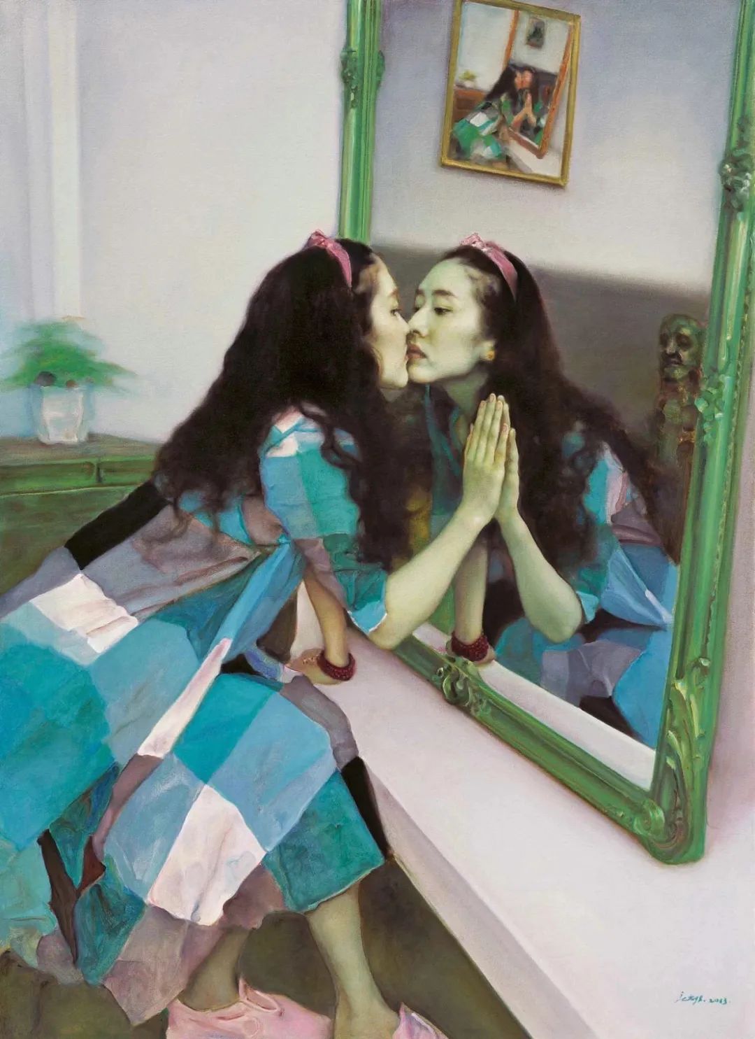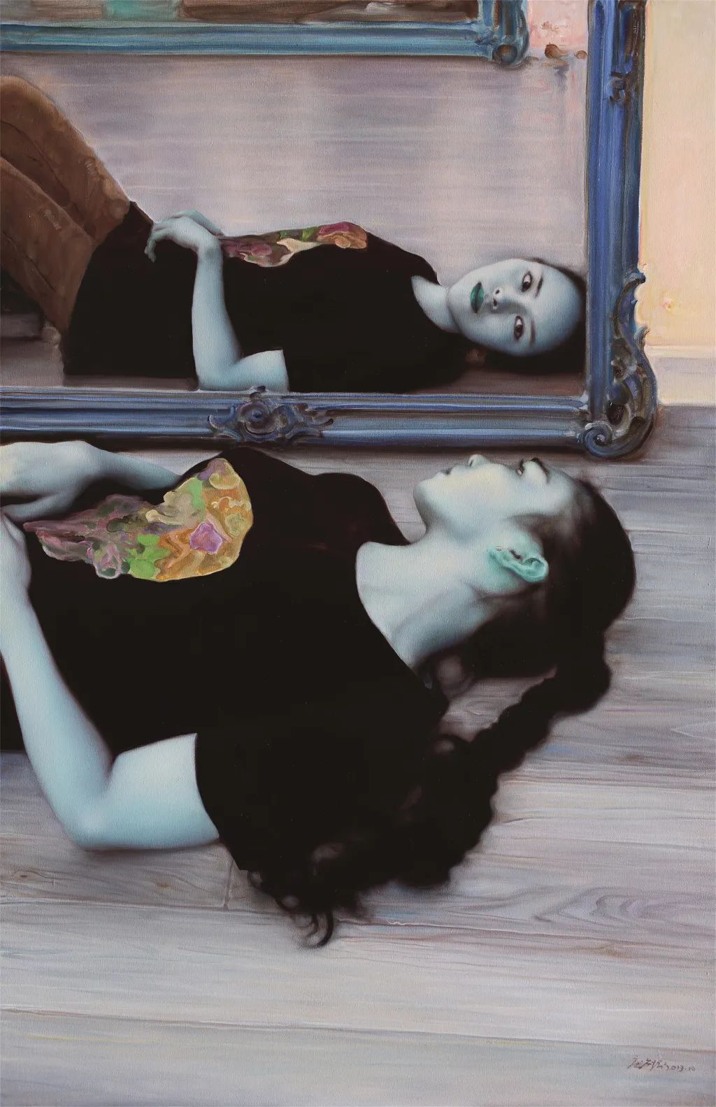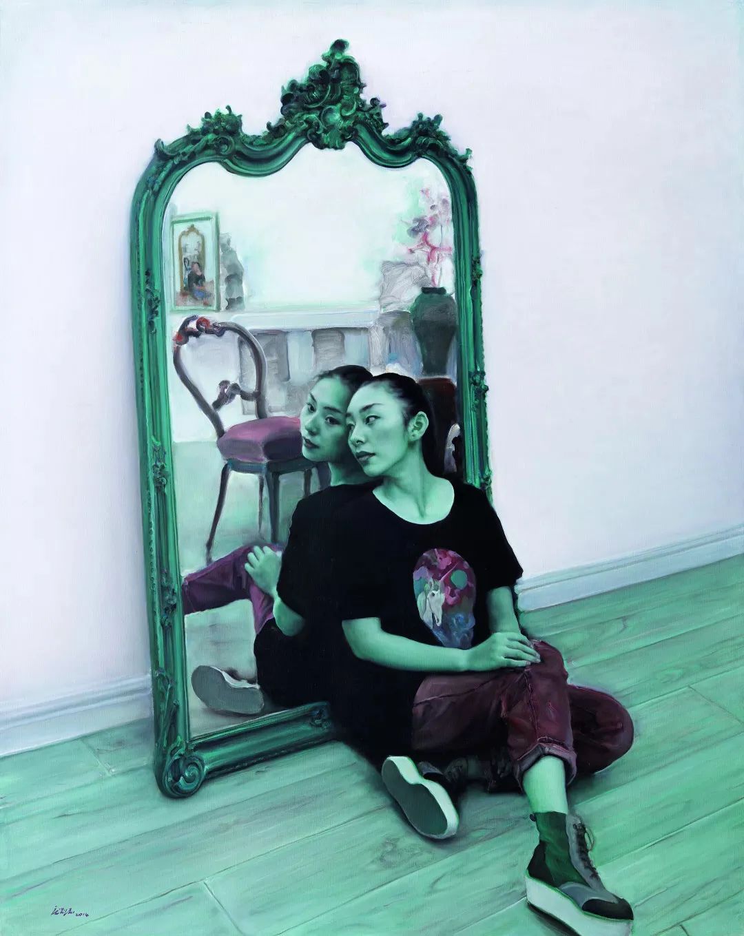 庞茂琨的“镜像系列”则进一步深入主体性的探讨。庞茂琨在这一阶段大量运用镜子、玻璃、屏幕等反射介质,通过复杂的空间嵌套,挑战观者的视觉习惯与认知边界。镜像系列深刻揭示了数字化时代的认知危机。当纳西索斯的神话演变为自拍文化,当真实自我被虚拟镜像肢解,庞茂琨用油画语言追问:在技术增殖的镜像迷宫中,人类究竟能否触摸到真实的存在?