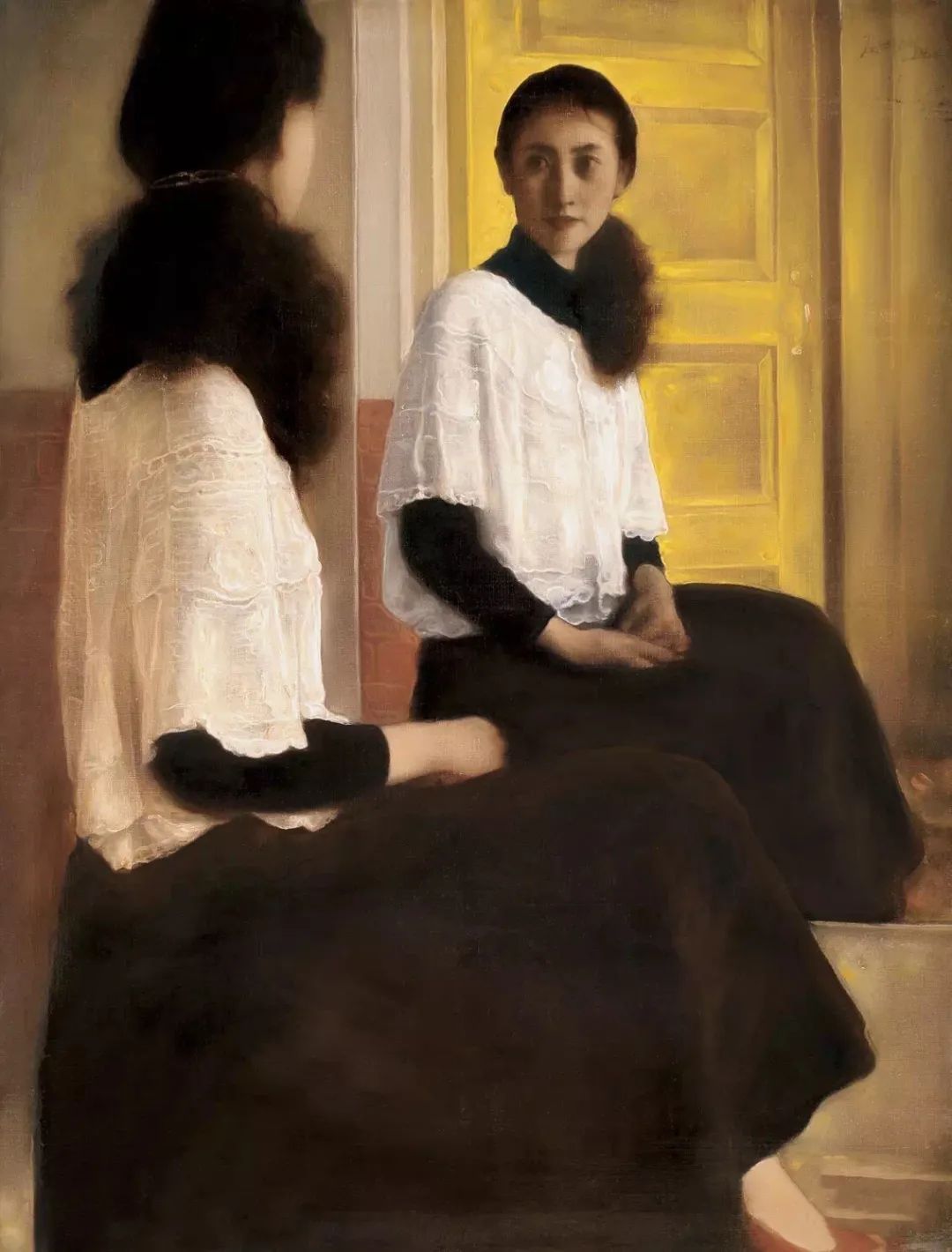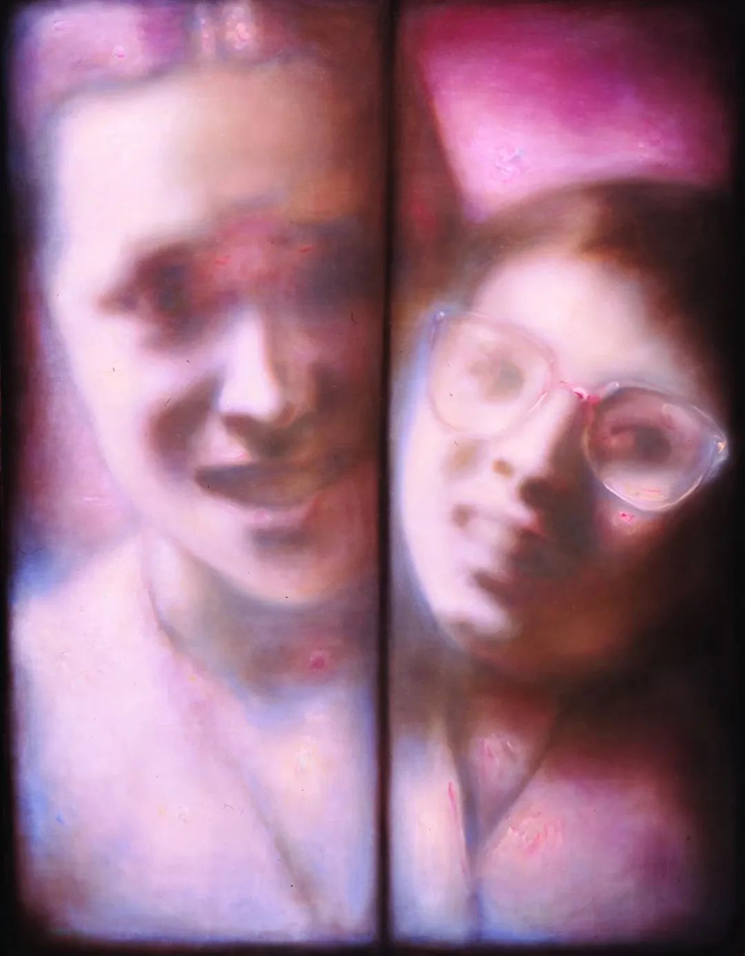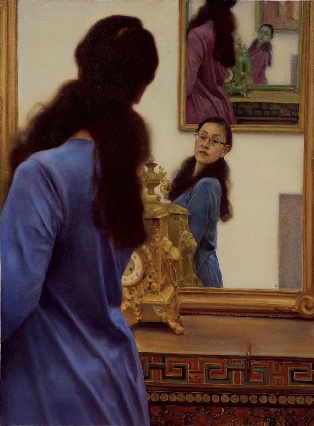 庞茂琨的“镜像系列”则进一步深入主体性的探讨。庞茂琨在这一阶段大量运用镜子、玻璃、屏幕等反射介质,通过复杂的空间嵌套,挑战观者的视觉习惯与认知边界。镜像系列深刻揭示了数字化时代的认知危机。当纳西索斯的神话演变为自拍文化,当真实自我被虚拟镜像肢解,庞茂琨用油画语言追问:在技术增殖的镜像迷宫中,人类究竟能否触摸到真实的存在?