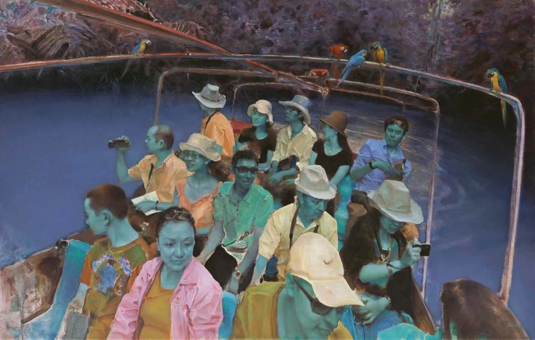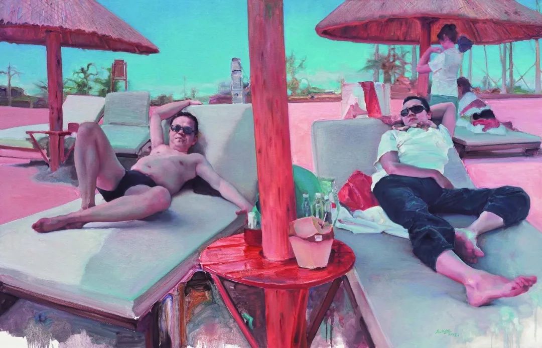 如果说舞台系列构建的是戏剧化空间,游观系列则直接切入现实肌理。《假日遐想》中,庞茂琨以消解性手法描绘人物度假场景:人物动态松散,色彩关系被刻意打乱,传统油画的空间深度被压缩成平面化呈现。这种熟悉与陌生的矛盾统一体,完美呈现出了“现实生活的第一经验”。