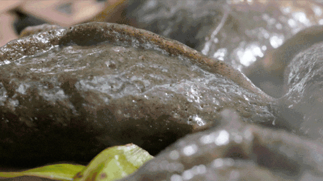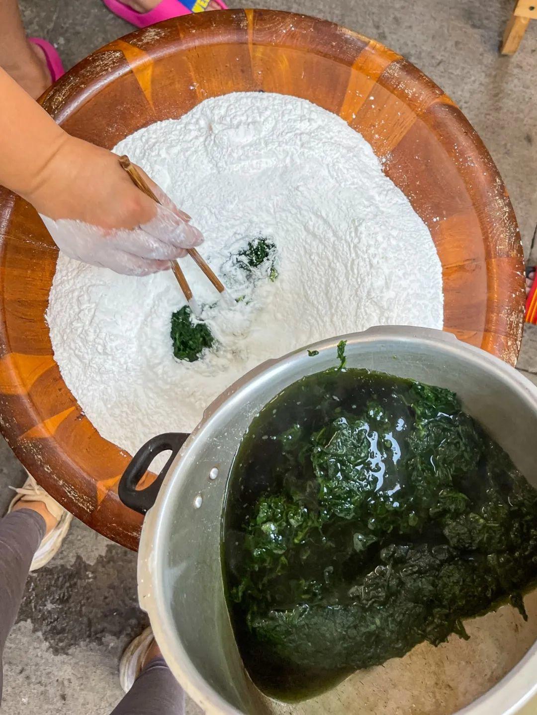这种几近于原始的清明粿做法,鼠麹草采回洗净后并不去榨汁机里打碎,而是直接上过煮。软化了的鼠麹草,带着叶梗直接进入糯米粉,再由二姨用手反复揉搓碾压。糯米粉被她一点点加到木盆里,被逐渐揉碎的鼠麹草以深深浅浅的青绿色也一点点散开到面团的不同角落,二姨穿着薄毛衣,脸因为反复的碾揉,热到泛出红色的光晕。