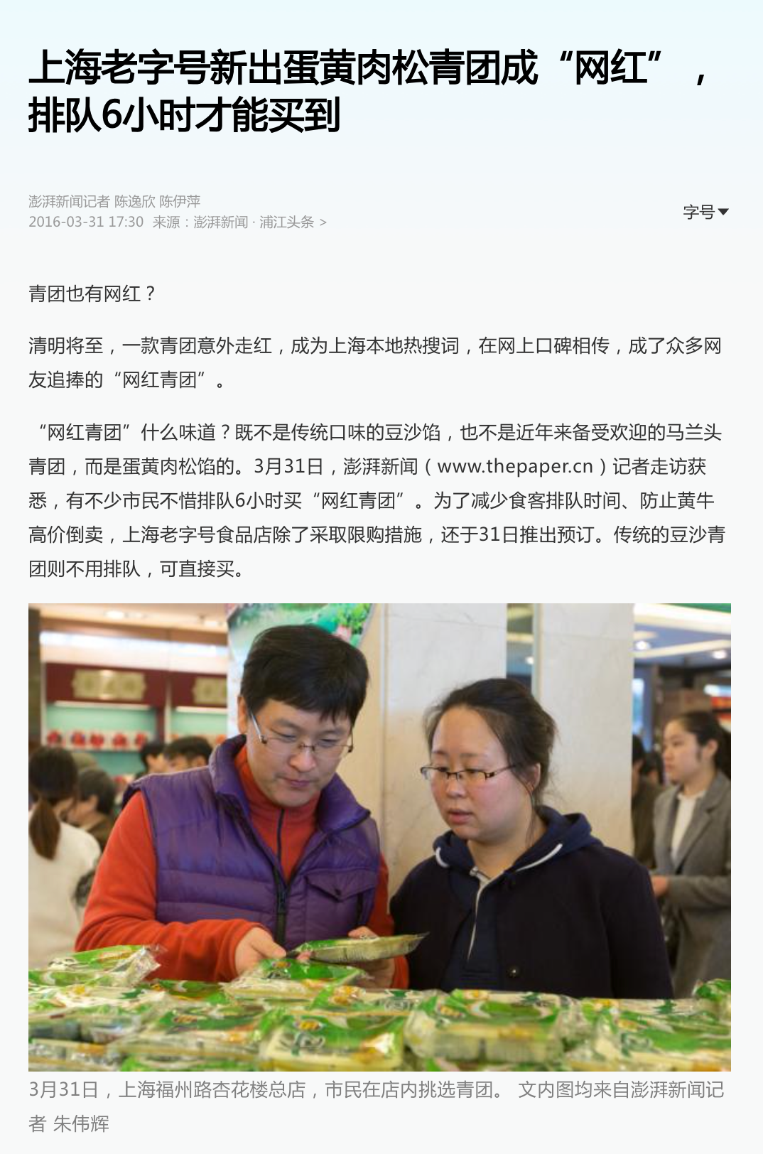 “你买的那种青团,我们也不吃的。我现在是专挑人,如果不是亲眼见到对方做,我都不敢买。我想送你的这个也是不对外卖的,是个老师傅,每年都是熟客跟他订他才做。机会难得哦!” 朋友这才松口,说她其实还是好奇真正的青团是什么味道,只是马路街边刺客太多,她也被刺怕了。