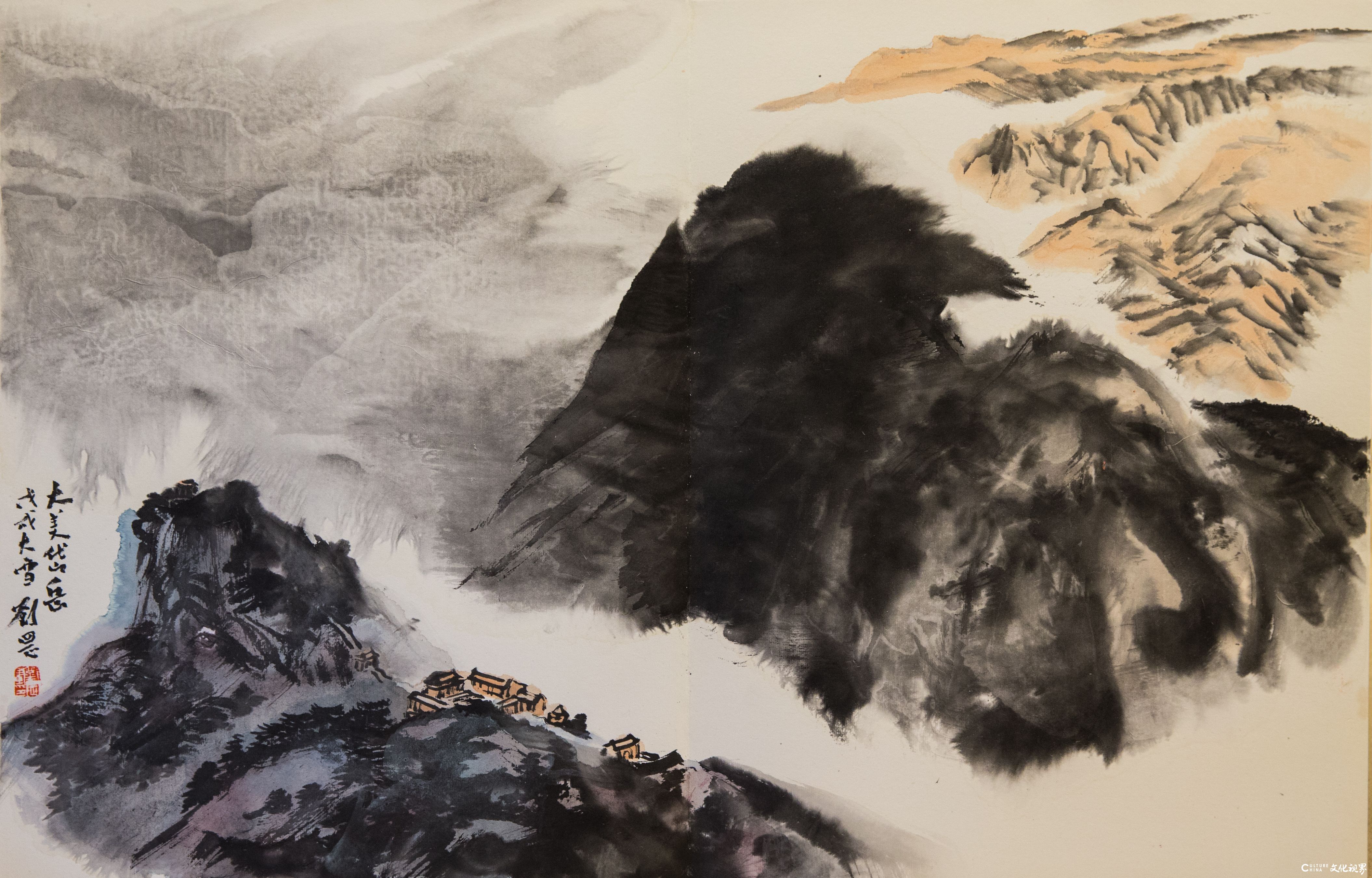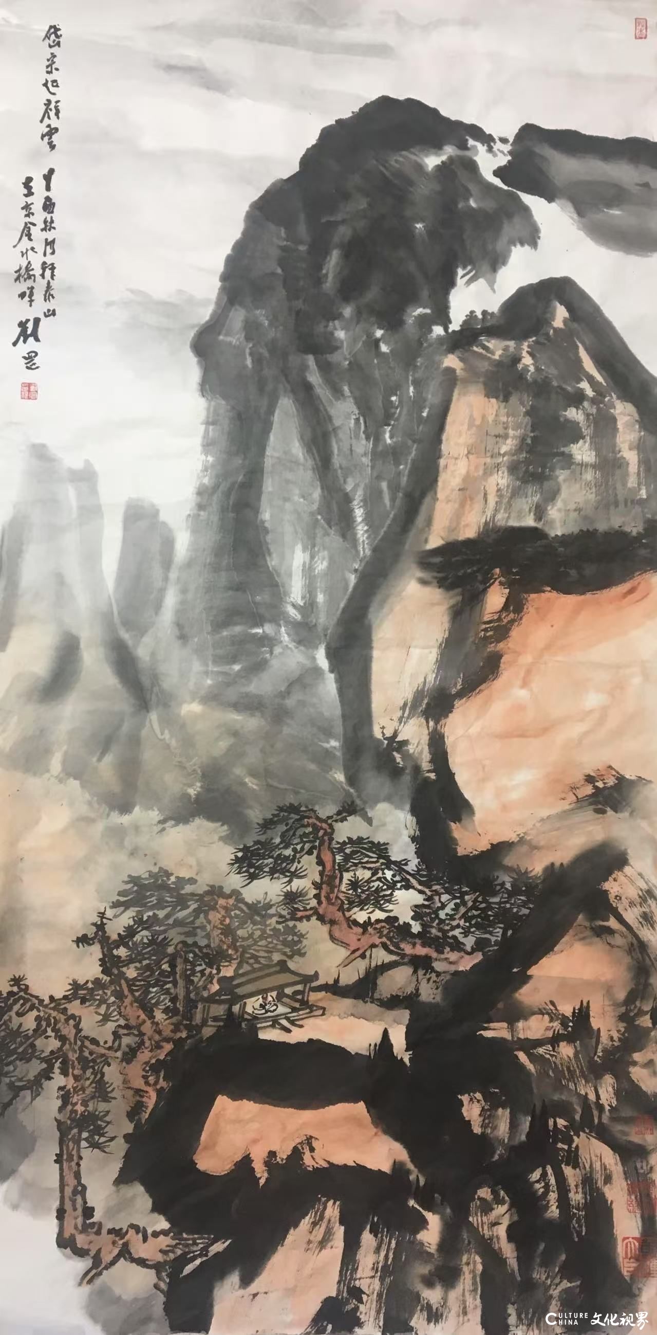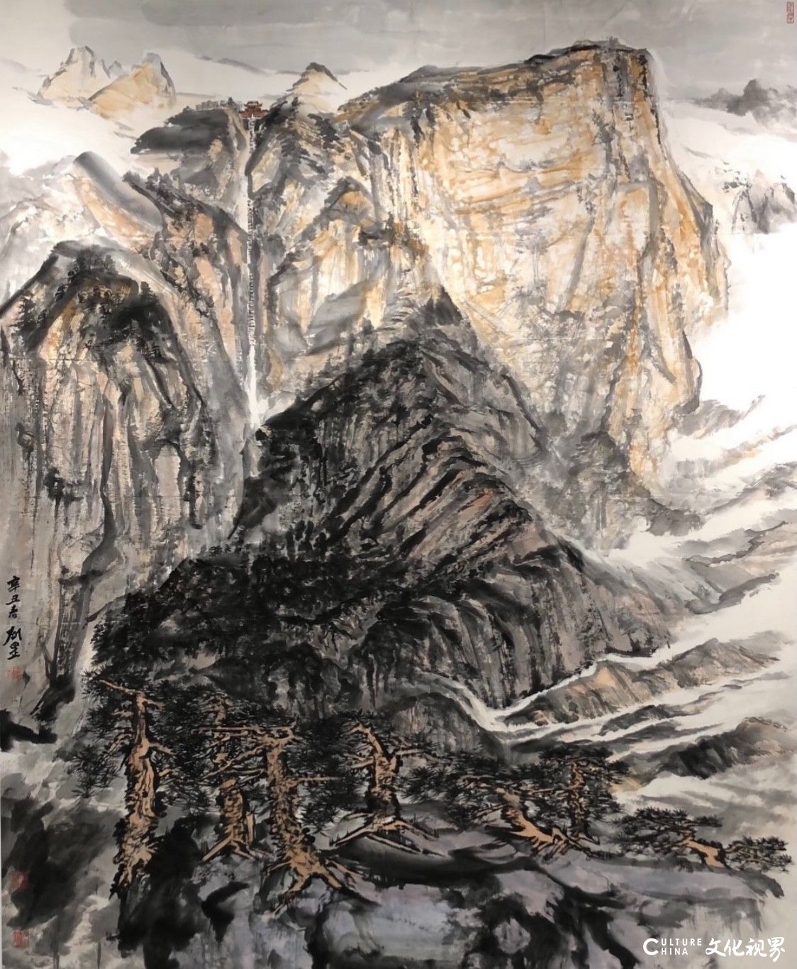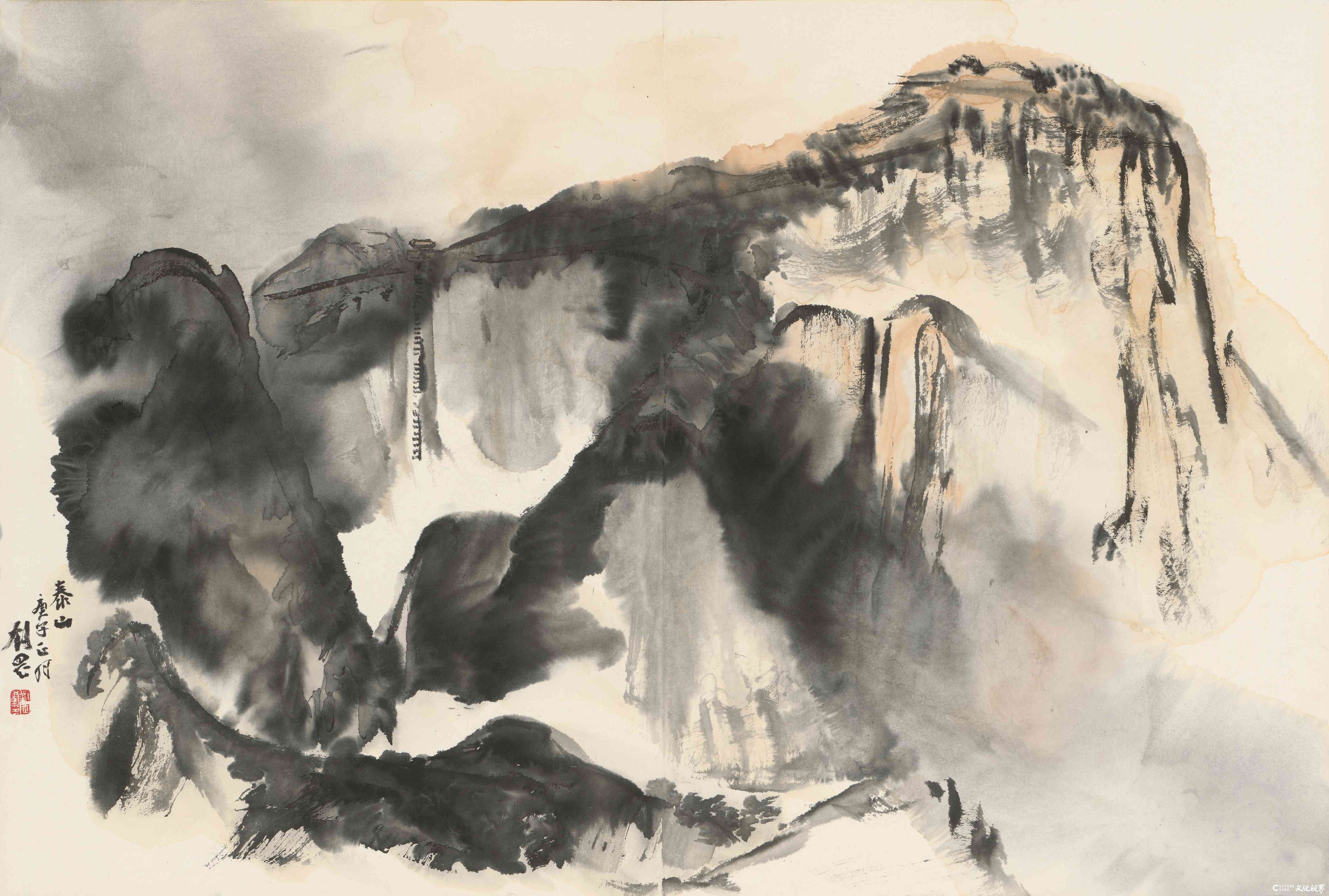 在当代山水画坛,刘罡以“泰山”主题创作独树一帜,其作品如黄钟大吕,在笔墨氤氲中奏响着传统与现代的对话。这位生于齐鲁大地、长于岱宗脚下的艺术家,将泰山的雄浑气象与东方哲学的深邃意境熔铸于丹青之间,以“海岱文化圈”为精神坐标,在当代山水画领域开辟出一条独具特色的艺术路径。他的创作不仅是对自然山水的诗意摹写,更是对中华文明精神图谱的当代诠释。