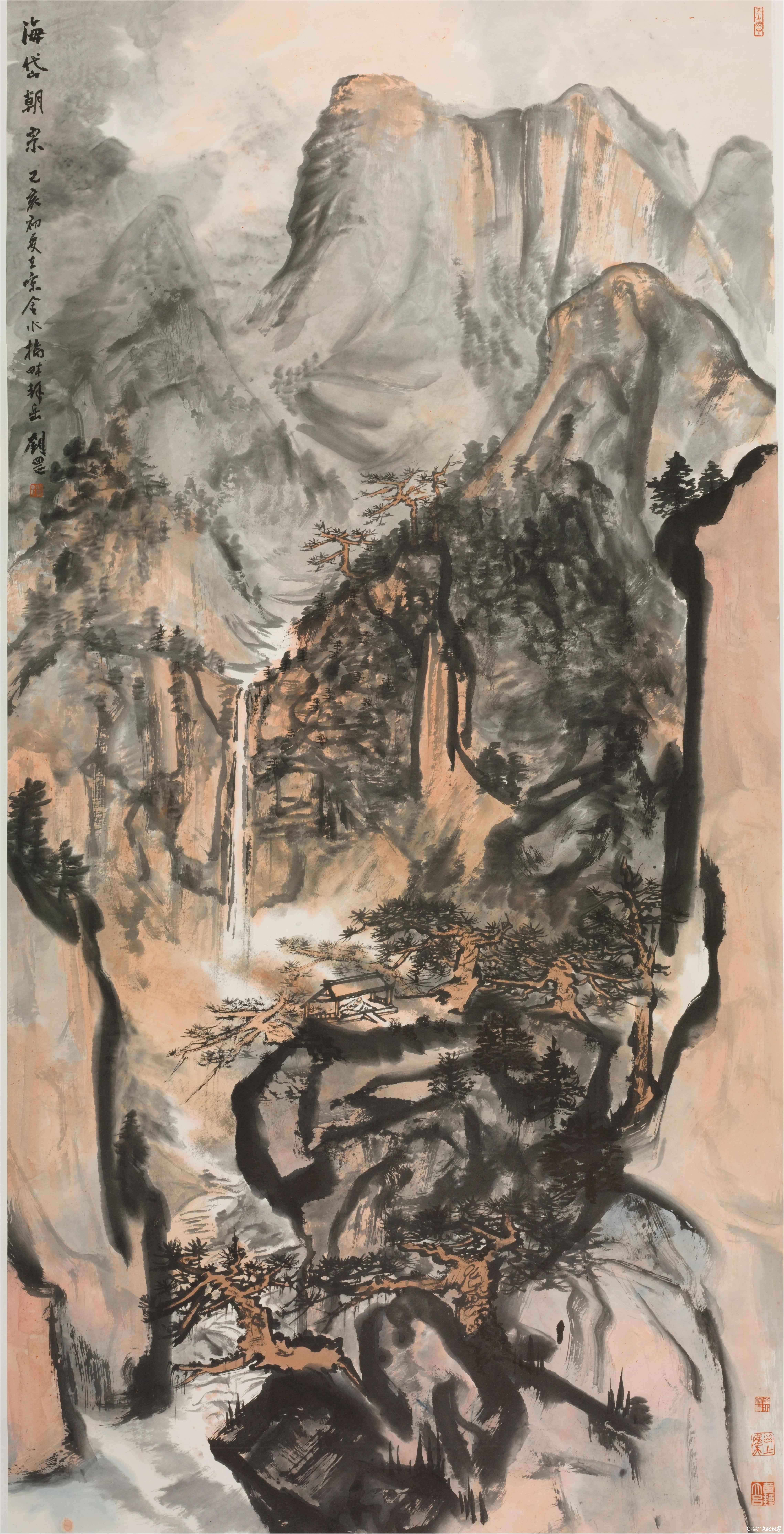 刘罡的山水画始终笼罩着一层“大哉乾元”的浩然之气。这种气象源于他对泰山文化的深度浸润,更得益于他在国家博物馆十载的文化积淀。作为中华文明的重要象征,泰山承载着“天人合一”的哲学理念与“登泰山而小天下”的精神境界。刘罡将这种文化基因注入笔墨之中,在《岱岳松云图》、《苍岩听涛》等作品中,以纪念碑式的构图、金石般的线条,构建出"仰之弥高"的视觉意象。他笔下的泰山不再是地理意义上的自然景观,而是转化为民族精神的具象载体。