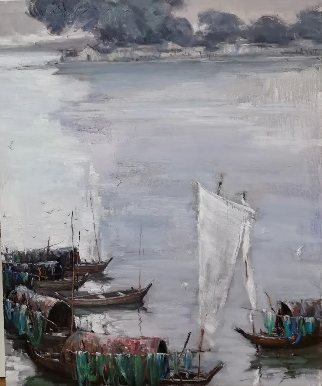 观其《瓯江帆影》,晨雾氤氲处有深远之思,桅樯林立间得平远之趣,云山掩映中显高远之致;品其《古堰春晓》,以水色破形,借光韵传神,将千年通济堰的斑驳肌理化作水彩画卷中的笔意趣味;在作品《暖风》中,艺术家以水色皴染之法,再现冬日傍晚的瓯江徐徐吹来的晚风,夕阳映照在江边画相乡的古建上;《细雨》画的是官岭古村,作者将“蒹葭苍苍”的古典意象,转化为瓯江边山村的当代写生,将“虽由人作,宛自天开”的营造智慧,凝练为古村落落的虚实构图。