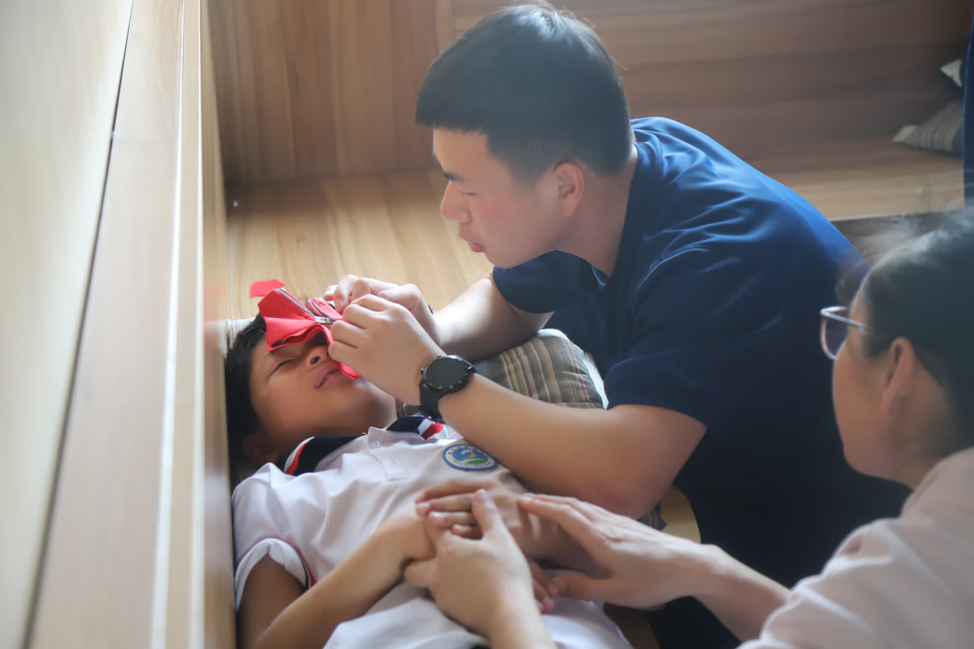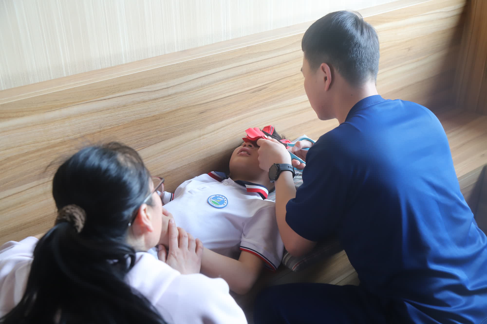 消防救援人员看到,男孩左眼眼皮被校服拉链夹住,校服的其余部位已经被剪掉,只剩下一截拉链夹住眼皮。消防员让学生躺在座位上,为方便观察被夹部位,消防救援人员用剪刀将多余的布料剪下来。