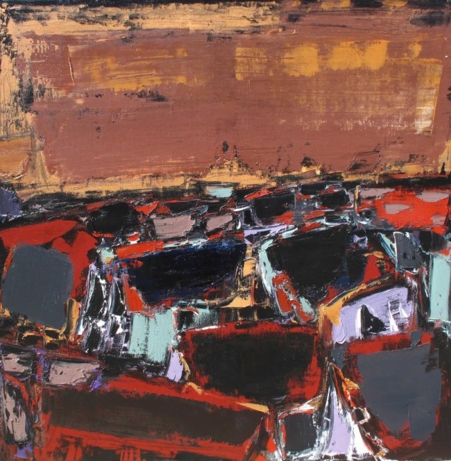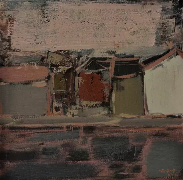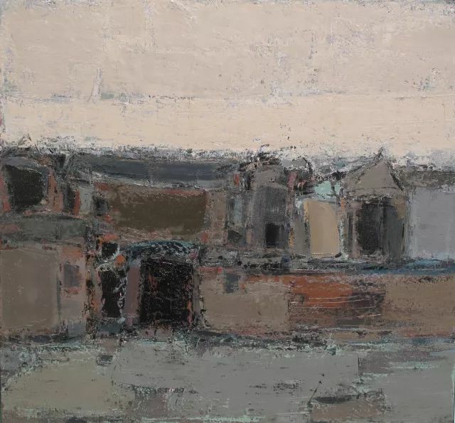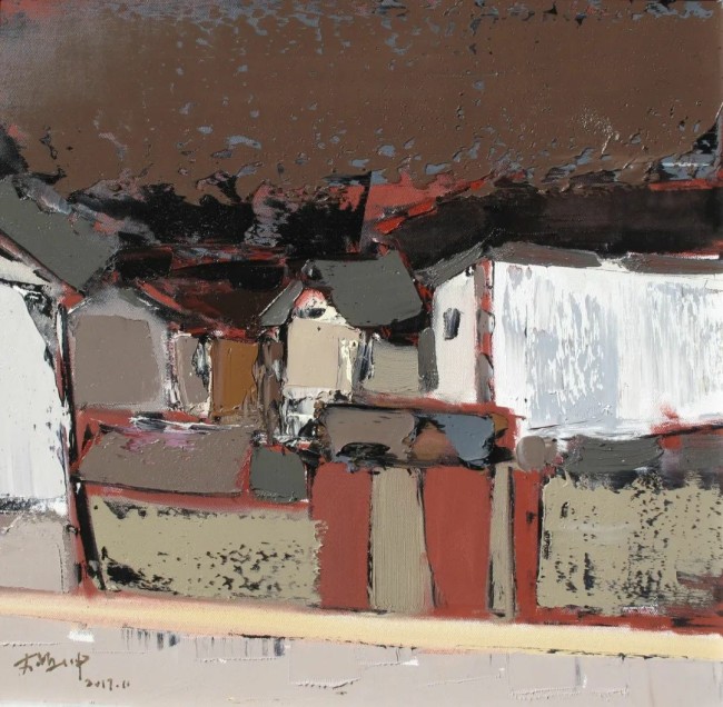 他的技巧是细腻而克制的。那些看似随意的笔触,实则经过精心的经营——线条的抑扬顿挫,色彩的微妙震颤,肌理的层层叠压,都在无声地渲染着庭院的静谧与雅致。他偏爱低饱和的色调,灰绿、赭石、黛青在画布上交织,偶尔点缀一抹暗红或暖橘,像是暮色中的一盏孤灯,让画面在沉静中透出一丝温度。这种色彩的运用并非仅仅是视觉的考量,而是情绪的投射——他的庭院,总带着一种淡淡的哀愁,仿佛时光在此停滞,而记忆却在此徘徊。
