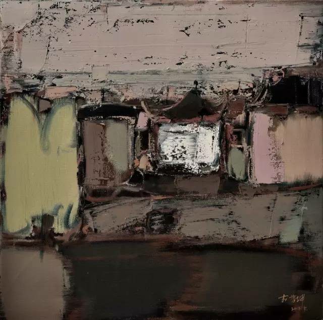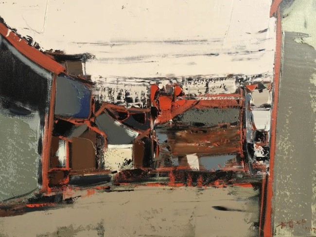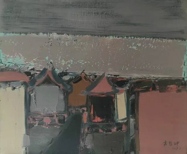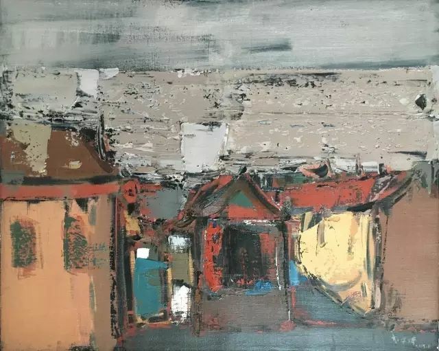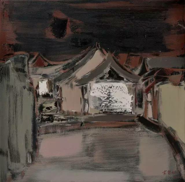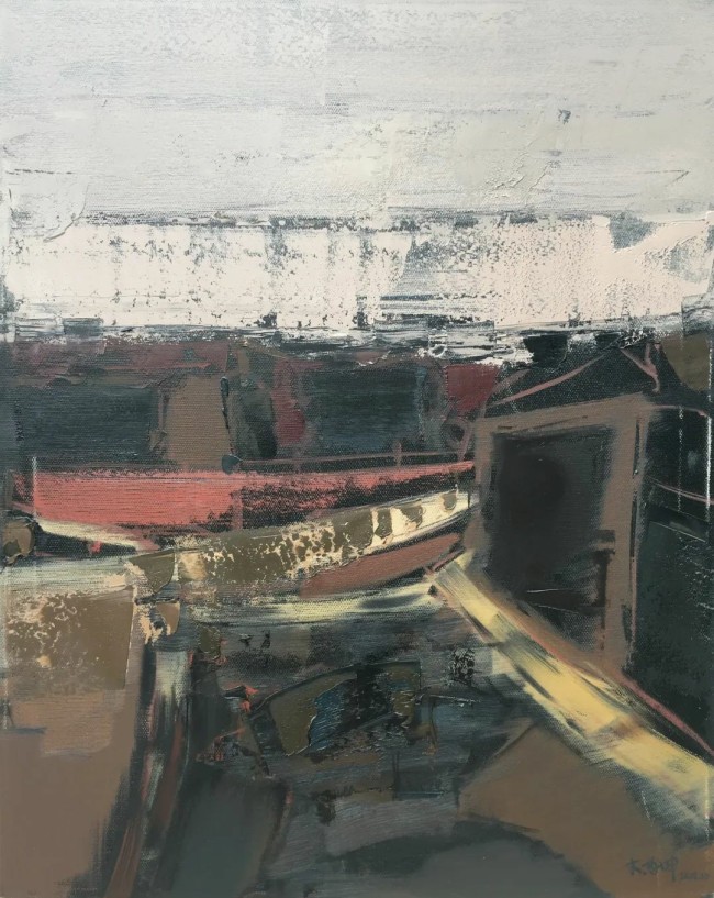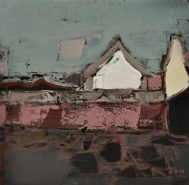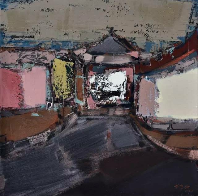 李哲坤的油画,像一场静默的独白。他的中国式庭院是从记忆与情感中抽离出的意象,带着朦胧的诗意与克制的哀愁。在他的笔下,庭院不再是具象的风景,而是点、线、面交织而成的精神栖居地——飞檐的弧度被提炼成一道悠长的曲线,青砖的肌理化作斑驳的色块,而院墙的阴影则凝结成一片深邃的墨色。他以主观化的概括,让画面在抽象与具象之间游走,既保留了庭院的形,又抽离出它的魂。