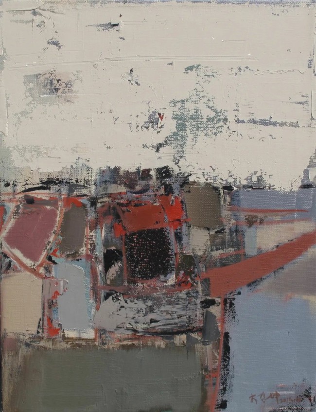 李哲坤的绘画语言是内敛的,甚至是压抑的。他不直抒胸臆,而是让情感在画面中缓慢流淌,如同低低的吟唱。那些交错的线条、斑驳的肌理、微妙的冷暖对比,都在诉说着某种无法言说的情绪——或许是怀旧,或许是孤独,又或许是对流逝时光的无奈。他的庭院里没有人物,却处处可见人性的痕迹:一道歪斜的门扉、一堵剥落的墙面、一片飘落的枯叶,都在暗示着曾经的存在与如今的缺席。这种“心理上的具象性”,让观者不自觉地代入其中,在静谧的画面里,听见自己的回响。