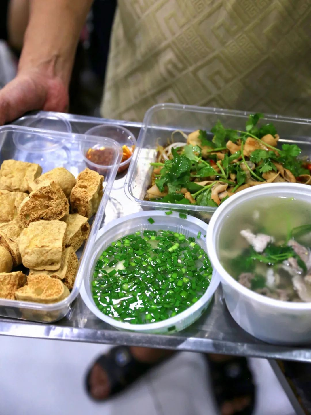 老板叫陈哥,店里肠粉的灵魂酱汁就是他的特调秘方:用蒜头油、花生酱调出咸淡适宜的普宁味,标配是空心菜、豆芽、猪肉和蛋;也有加虾和牛肉的“奢侈进阶版本”可选;还有每天限量40份的炖汤,生熟地黑豆炖排骨,或是枸杞党参炖家鸡,都让每个努力拼搏出新成绩的翻身人,在伙食上有了给自己嘉赏的机会。