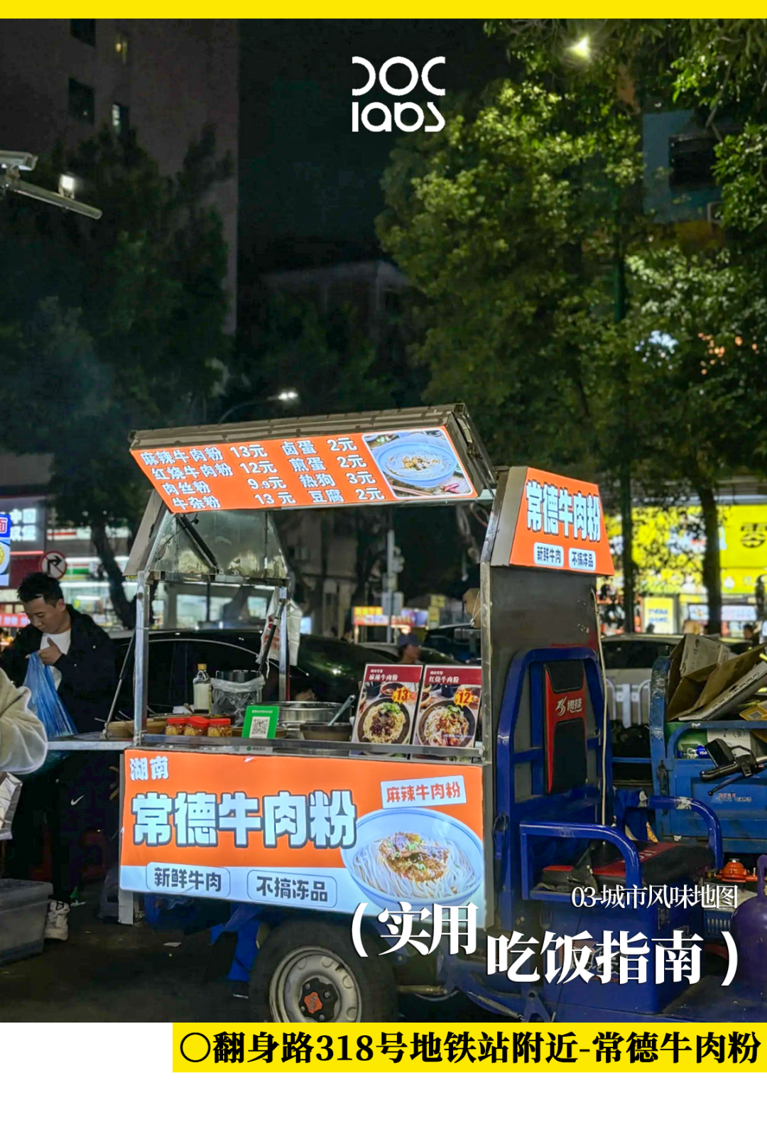 开小卖部的江西大姐,则觉得夜市里最近那个年轻小伙出来摆摊的常德牛肉摊。“是湖南人都说的地道”,“用的是圆的湿米粉,猪油渣和炸辣椒都老板自己炸的!”小摊装在一辆移动的三轮车上,年轻的老板会热情地招呼每个客人加他微信:“我出摊了都会在朋友圈里说,你们别跑空了。”