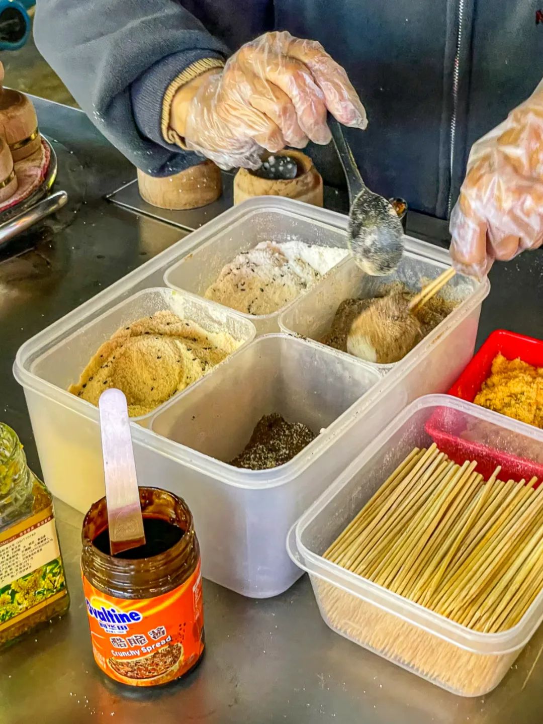 除了腹胃已然习惯并依赖的定点摊贩,翻身人每天早上也会记得关照地铁站B出口那架流动的无声糯米糕摊子。三位“无声”的聋哑朋友,每日现蒸现卖竹筒糯米糕,10元能买6个,刚好6种不同口味。大家用手指示意点单,他们相互间眼神传递,就开始飞速在模具里盛上糯米粉,放在蒸笼上蒸透。每次做完几轮,他们也会默契地打理桌面保持整洁,勤快而体面地构成清晨翻身故事里治愈的一章节。