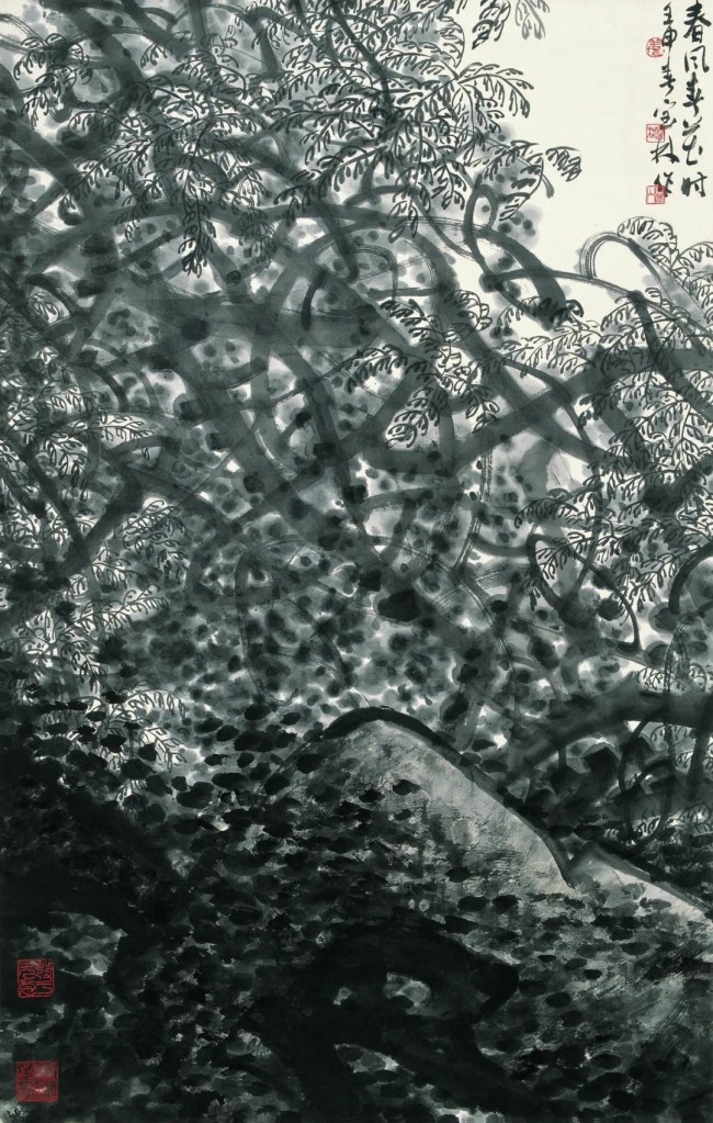 第三种是大写意花卉,所画对象,除香榧系列之外,多是前人描绘过的平常花木,但画得非常出色。论其渊源,始于潘天寿及其传派,起步就磅礴大气,泼墨淋漓,神光焕发,不同凡响。九十年代初期以来,也酝酿出两种自家面目。一种面目,粗枝大叶,简当提炼,讲求构成,富有形式感。另一种似乎受到山水画的启示,画成林成片的树丛花丛,或密叶繁枝,或硕实累累,或闪动阳光,或浮动清雾,既把中景拉到目前,又引入山水画的树法和叶法,标新立异,不与人同。