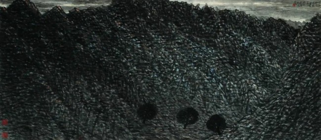 第二种是积墨山水,不以笔胜,而以墨胜。这种作品,大略由李可染的积墨,上溯黄宾虹积墨的皴点交织积叠,强化了他得之于江南、西北、雁荡山和嵩山各地的感受。一律求其大象,布境多雄浑高旷、笔墨则气厚思沉。但有三类面目,其一拉近景观,甚至仅一座山、一片林,强调大的开合,突出大的形影。其二,布境参以平面构成,造型多为几何图形,夸大对比,气局宏敞,非常惹眼。两类都显现了密林间的光斑闪烁,拓宽了山水画所表现的视觉感受。另一类则如白描山水的照相底片,计白当黑,奇趣横生。