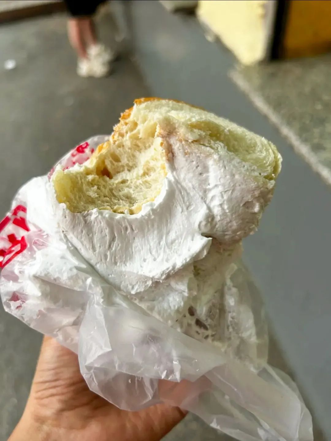 我想起刚刚跟我唠嗑的大叔。他一个劲儿跟我强调做面包的老人家们不用机器,全靠手工,又说过去更便宜只要1块钱,现在涨价了才到2块钱 ——这话如果仔细推敲,怕不是疑点重重。