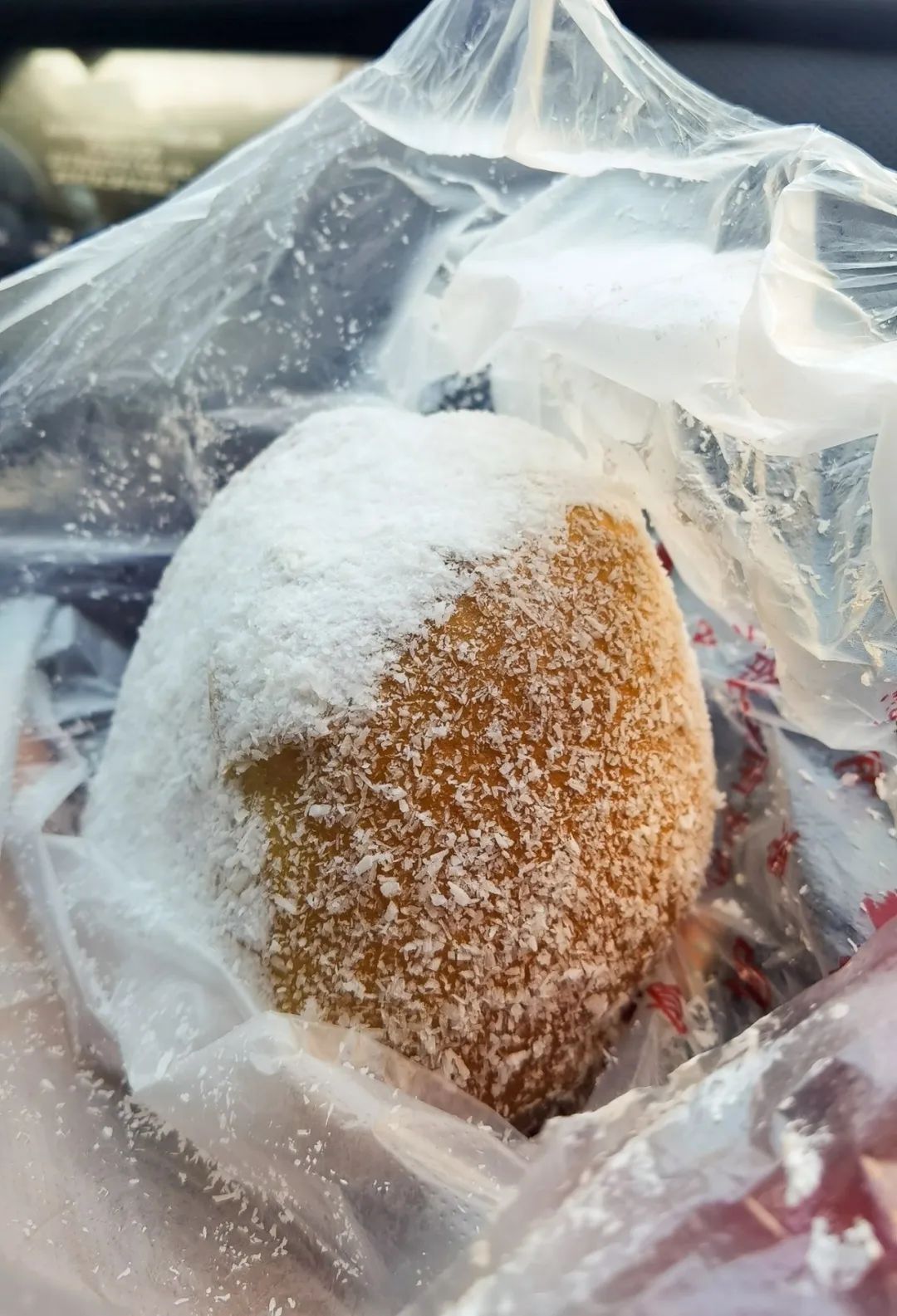虽然才开卖不到15分钟,面前就只剩两三种了。七十岁“姐姐”忽然冒出一句,“你等一下,我再去端一盘’雪山’。”我和排在后面的顾客们都忍不住欢呼起来。我一口气买了三个“雪山”、其余的面包一样来一个,总计21.5元,整整三大塑料袋 —— 这样的价格在市中心的面包房,估计一个都买不下来。