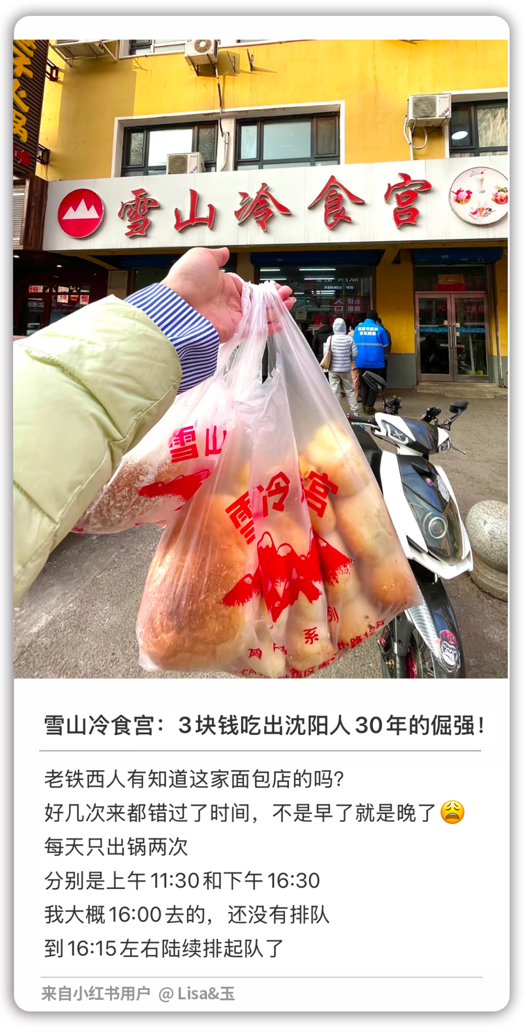 大概三十多年前,沈阳流行起了雪糕热,还是工人聚集地的铁西也成立了国营的雪山冷食宫。但这毕竟是老铁西,靠一把力气谋生活的工人们,热爱主食远超过了甜食,雪糕怎么也卖不动。于是雪山冷食宫的师傅打着羊头卖狗肉,开始转战豆包、馒头、糖三角,还在塑料袋上印了一句“别拿豆包不当干粮”的广告语。然而仅卖豆包,养活不了这十二三个师傅,老师傅们就有样学样地开始跟着书学做面包。
