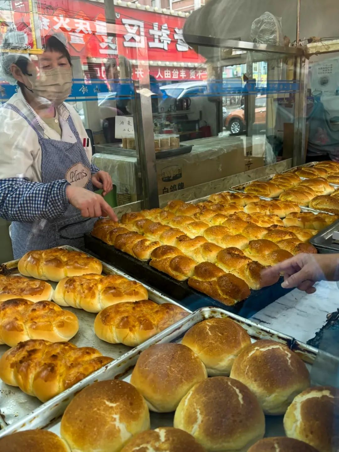 我猫下腰,远远从卖货的玻璃窗口往里看。十个看起来上都五六十岁大哥大姐,穿着白色的大褂,系着围裙,戴着口罩,忙得脚不沾地。玻璃窗里卖货的大姐,一边按照顾客的要求夹起面包一边放在塑料袋里,连计算器都不用,顾客说完,她就迅速报出价格。