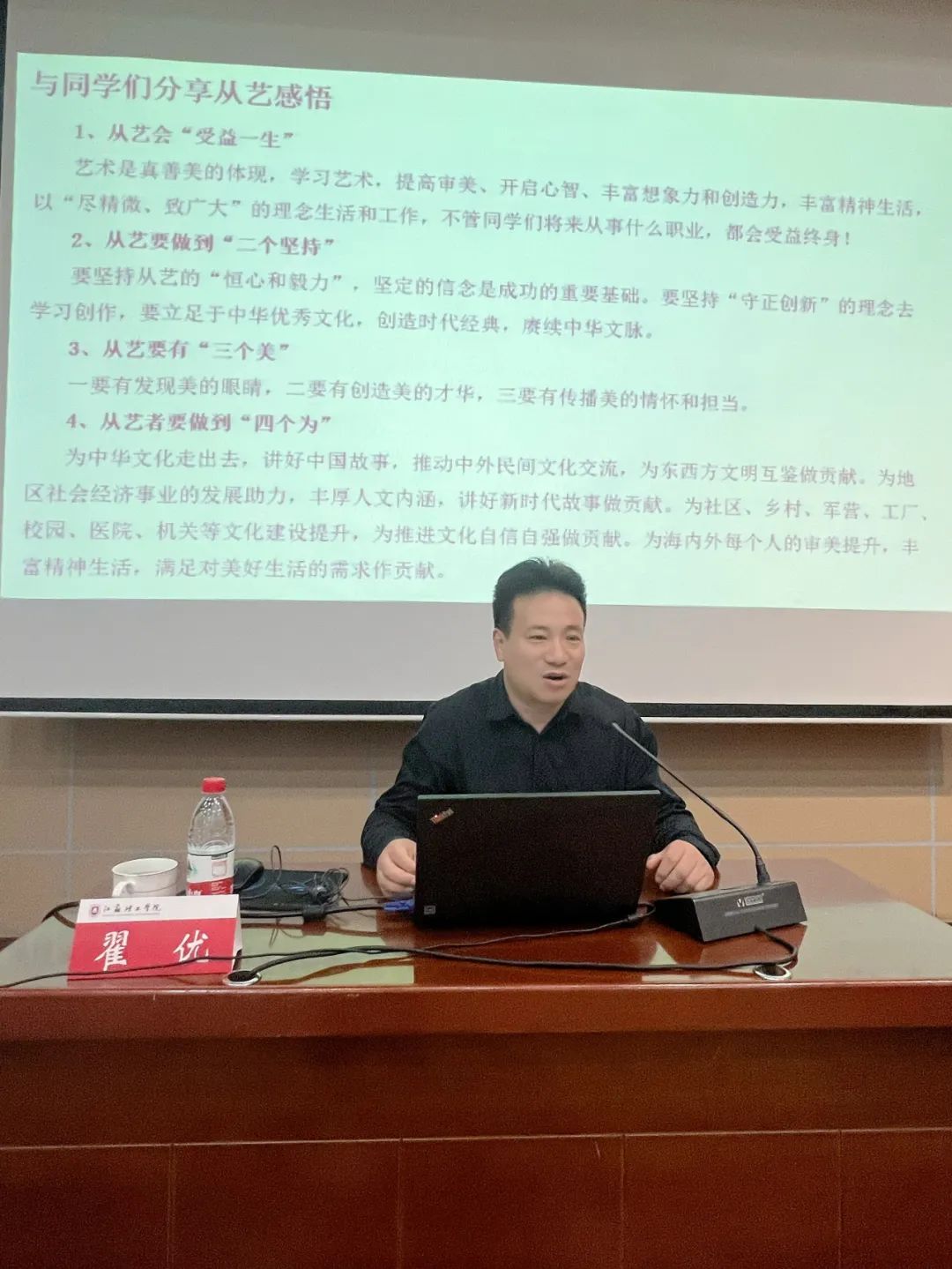 讲座现场,翟优为师生们系统梳理了江苏中国画的发展脉络,从历史传承到当代创新,生动展现了江苏中国画独特的艺术魅力与文化底蕴。深入浅出的讲解、详实丰富的案例,不仅让在场师生对江苏中国画的发展有了更深刻的认识,更为他们的艺术创作与研究提供了全新的思路与视角。