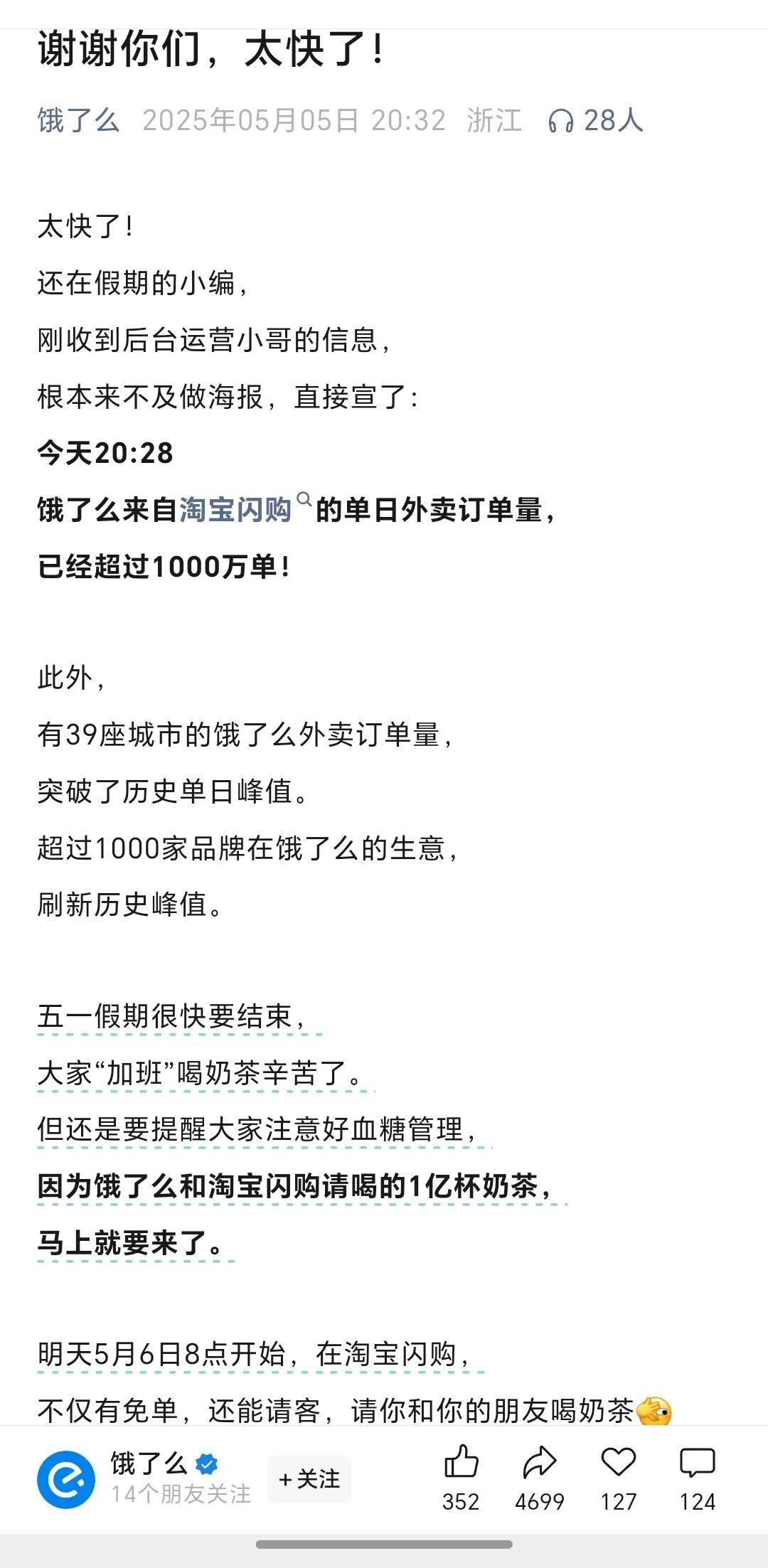 而淘宝闪购仅用6天达到“千万单”后,补贴力度还在加大,刚刚宣布自5月6日起每天免单1亿杯奶茶,这又预示单量的涨势才刚开始,还远远没有达到峰值。