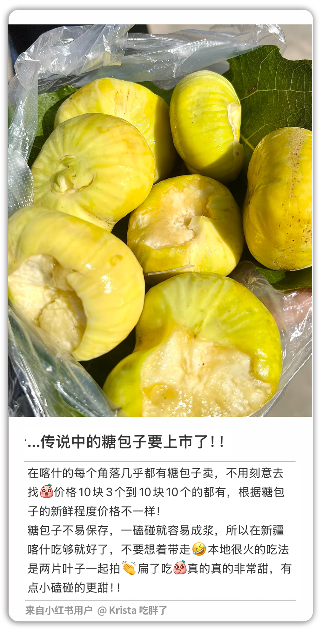 这几年来南方工作,同事得知我老家是新疆,就会拜托我给她买“糖包子”。刚开始我对这名字有点疑惑,看了图片我才知道,就是我们那种新鲜早黄无花果。“我有朋友去过新疆,跟我回来说你们那的糖包子无花果吃起来惊为天人,我上网买了一箱,又贵又不甜又渣口感,应该是被坑了。”
