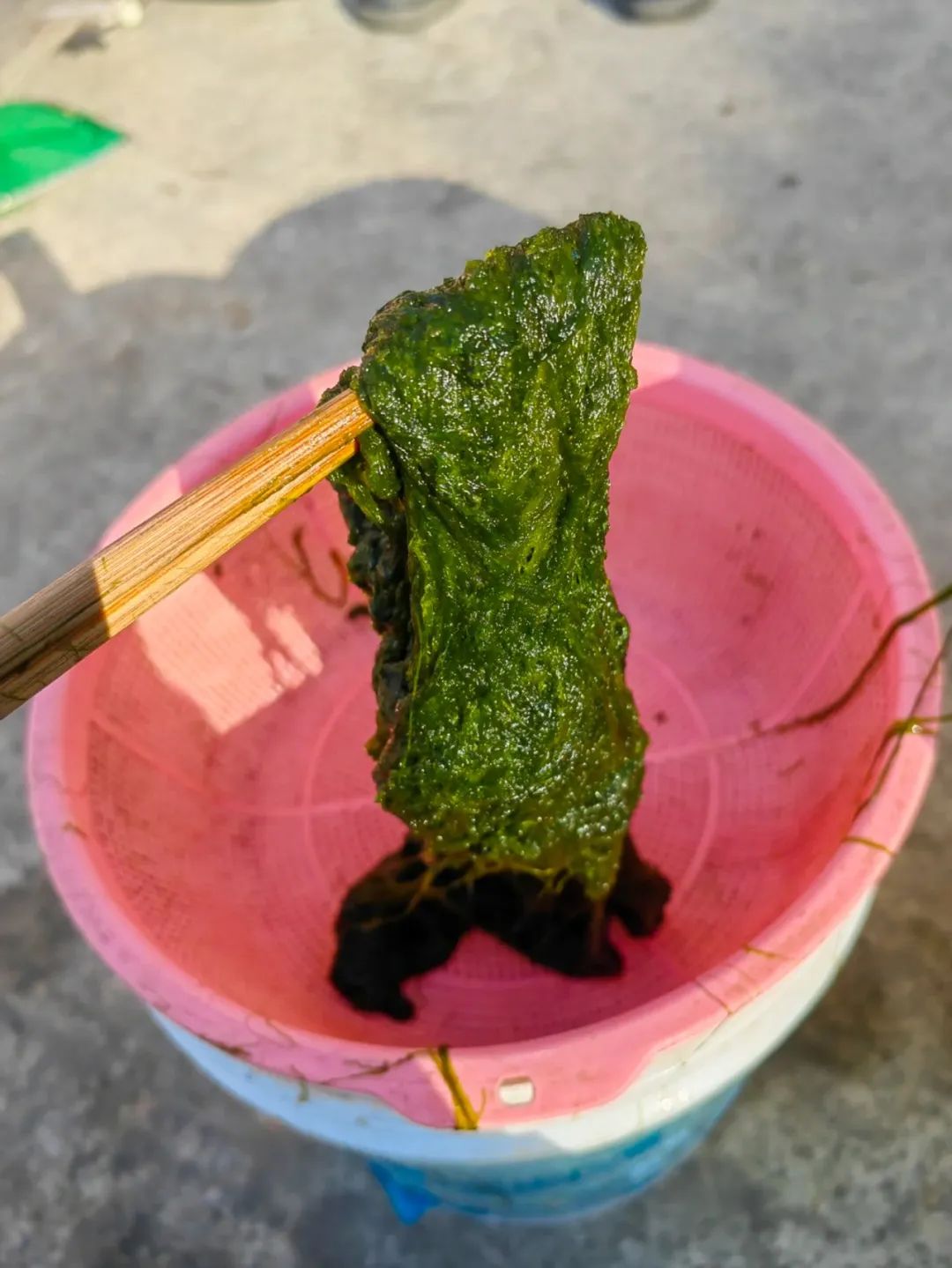 我是看了风味人间5才知道,它学名原来是浒苔。只存在于每年冬末春初的咸淡水交汇潮间带,像地毯一样铺开在滩涂上,采收几乎只能靠人力。记忆里我只见过新鲜浒苔几次,只在很少的菜摊有:一个塑料桶,上面扣一个带孔可以沥水的塑料盆,外加一双筷子,新鲜苔条就在里面,跟“呕吐物”一样,又像水里泡了很久的头发,黏黏的。