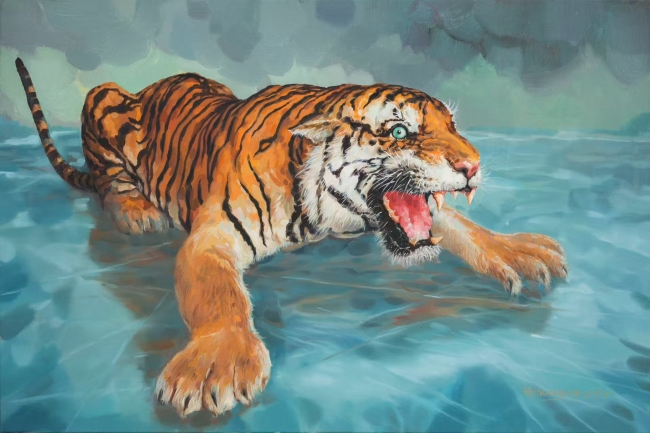 观其笔下的老虎,威严而充满张力。邱光平以独特笔触营造出神秘而紧张氛围。暗沉底色与浓郁金黄老虎毛色形成强烈视觉冲击,凸显冲突。赤膊之人与群虎互动,动作姿态传递出挣扎与对抗感。老虎或卧或立、张牙舞爪,似充满野性与威胁,又仿佛隐喻着现实困境;人于虎群中,似在奋力周旋,象征个体在压力与危机中的艰难应对。整体画面借人与虎的对峙,深刻表达出对生存境遇的忧虑、对人性在困境中挣扎的思索。