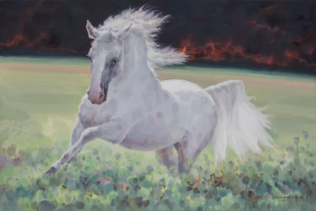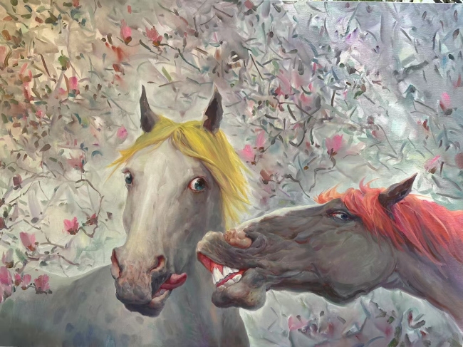 大胆而奔放的色彩犹如一首激昂的交响曲,在画布上奏响独特的旋律。拟人化的马成为其作品极具辨识度的符号。大面积高饱和色彩的使用,堪称视觉上的大胆挑战。柠檬黄带来的失衡、脆弱、紧张、焦虑等直观生理感受,如同一把锐利的剑,直直地刺向观众内心,让人们无从回避,不得不被拽入他预设的命题之中。当我们凝视那些以柠檬黄为主调的画作时,仿佛置身于一个充满冲突与挣扎的世界。在一幅幅描绘战场场景的作品里,柠檬黄的底色恰似熊熊燃烧的战火,炽热而又危险,马匹在这背景下的挣扎显得愈发惊心动魄,强烈的色彩冲击让我们深切感受到战争的残酷与生命的脆弱。这种色彩的运用,不仅是对传统美学规则的挑战,更是他表达内心对世界认知的独特方式。
